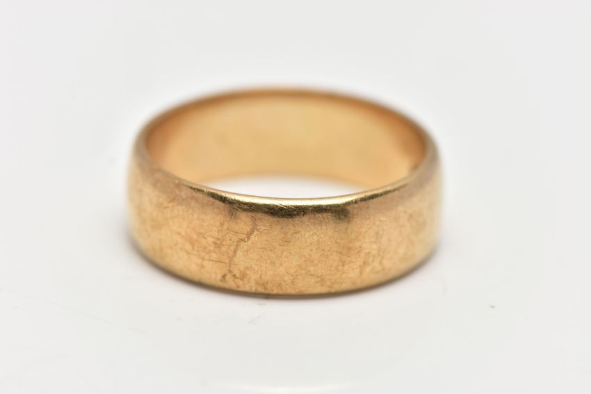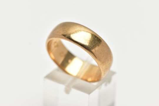 A 9CT GOLD WEDDING BAND, designed as a wide D shape cross section plain polished band, personal engraving to inner band, hallmarked Birmingham 1967, approximate ring size V, approximate gross weight 8.0 grams (condition report: overall condition good, tarnish, scratches present, in keeping with general wear)