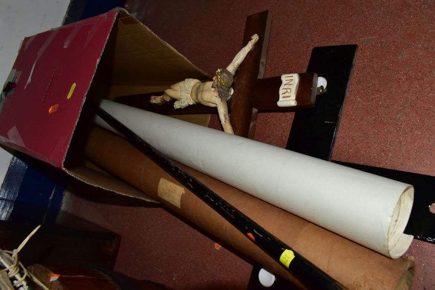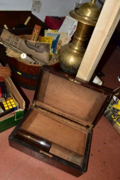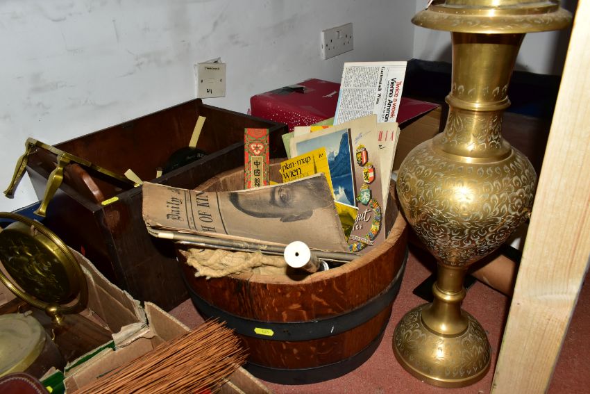 THREE BOXES AND LOOSE to include an African fly whisk with beaded handle, a writing slope in need of some attention, a Sunwatch pocket compass by The Ansonia Clock Company, a half barrel, a boxed Concord harmonica, a cased pair of binoculars marked 'W Gregory & Co, 51 Strand, London', a Players Regent tobacco advertising ashtray, a brass trivet and large covered vase height 63cm, a Westclox Big Ben alarm clock, a walking cane with Mr Punch handle, etc (3 boxes + loose) (sd)