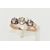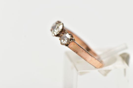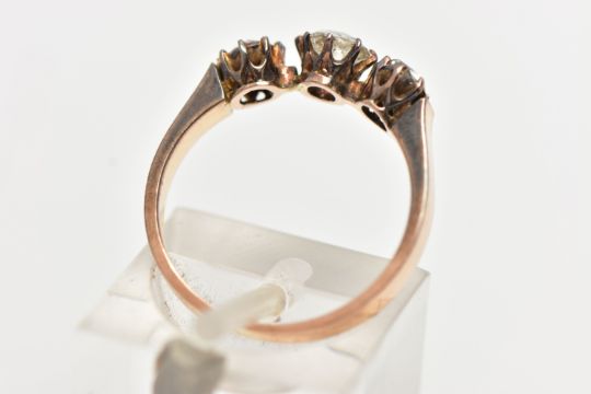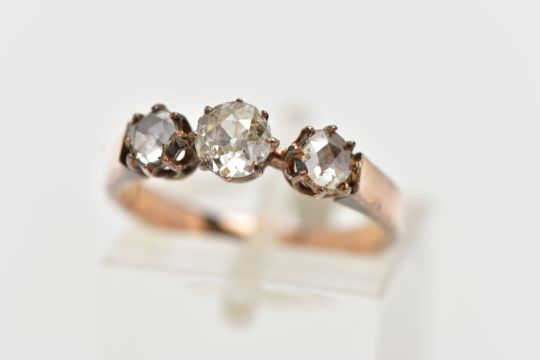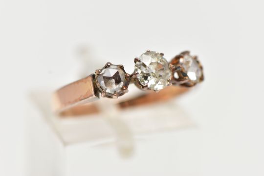 A YELLOW METAL DIAMOND RING, centering on an old cut diamond, and two rose cut diamonds, prong set in a yellow metal, leading onto a flat slightly tapered band, unmarked, ring size M, approximate gross weight 2.9 grams (condition report: general moderate wear, some nicks to center stone, would benefit from a gentle clean)