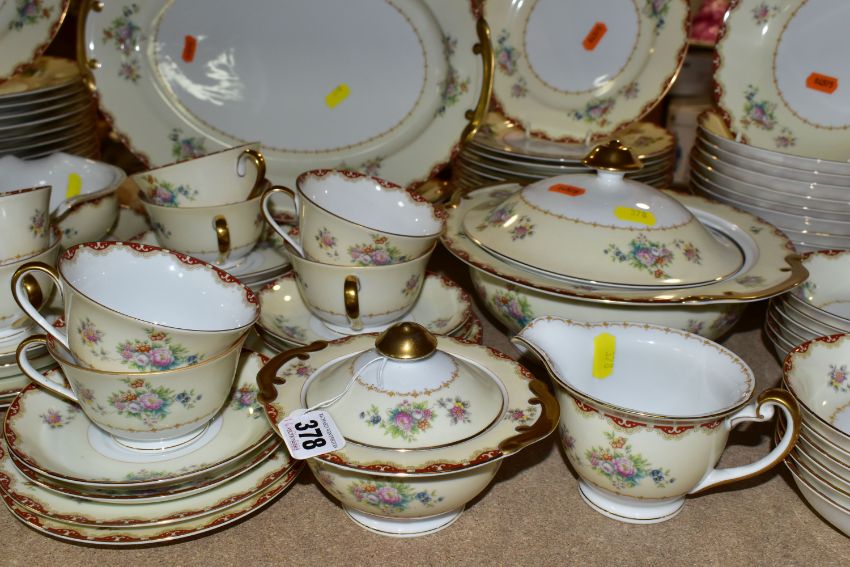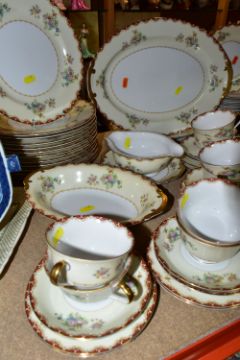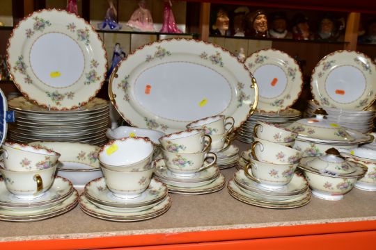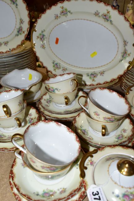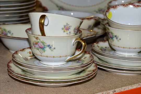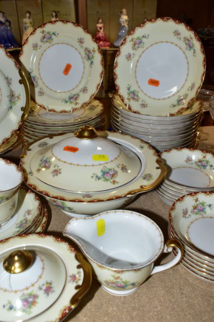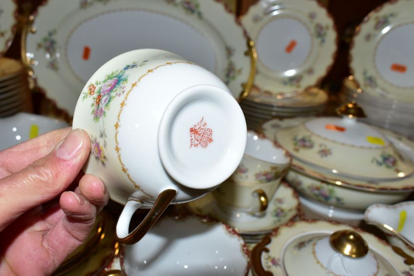 A PORCELAIN DINNER SET, makers mark on base NS, possibly continental, comprising one covered tureen, covered sugar bowl, milk jug, one salad dish, one integral sauce jug, twelve fruit dishes, twelve dishes, twelve cups (one has a tiny amount of pitting inside), twelve saucers, twelve tea plates, one large meat plate, one small meat plate, twelve side plates, twelve dinner plates (91) (Condition report: no obvious damage, signs of very light use)