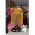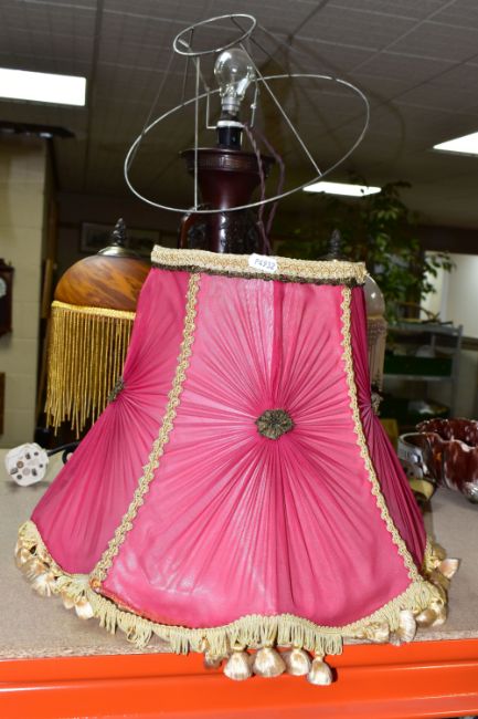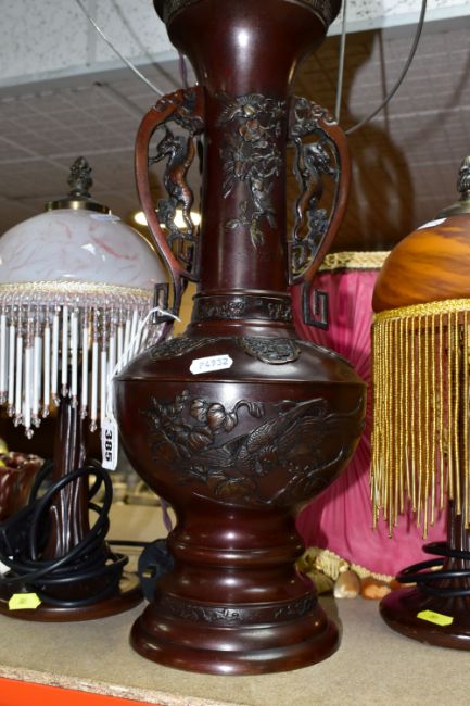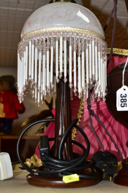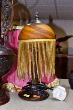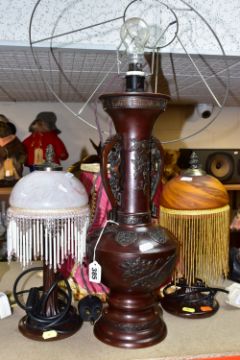 AN ORIENTAL BRONZED LAMP BASE POSSIBLY CONVERTED FROM A VASE, decorated with birds and cherry blossom, height 45cm (in need of rewiring), together two boudoir lamps with glass shades and beaded fringe one in pink and white, the other amber coloured, height 36cm and a vintage ruched lampshade in red with a gold fringe