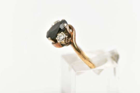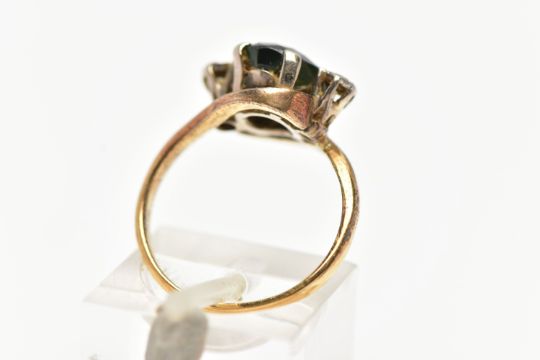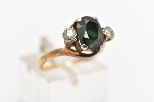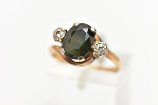 A YELLOW METAL SAPPHIRE AND DIAMOND RING, centering on an oval cut bluish/green sapphire in a four claw setting, flanked with illusion set round brilliant cut diamonds, estimated total diamond weight 0.10cts, polished yellow metal cross over shoulders and polished band, stamped '18ct & Plat', ring size L, approximate gross weight 4.1 grams (condition report: visible colour banding within the sapphire, stones are secure within their setting, would benefit from a gentle clean)