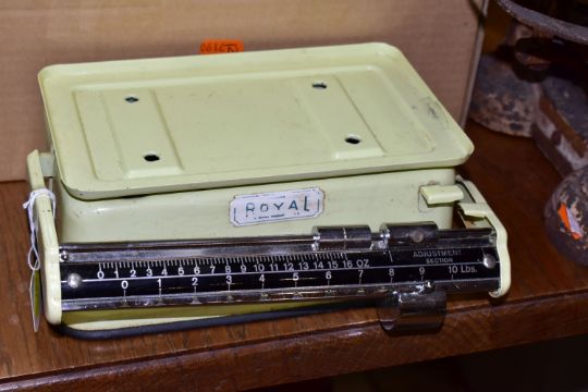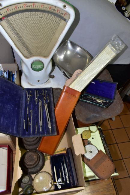A BOX AND LOOSE SCALES, TECHNICAL DRAWING AND MATHEMATICAL APPARATUS, to include a set of Avery shop counter scales, a set of J & J Siddon cast iron scales, a set of pale yellow 'Royal' scales, a cased Fowler's long scale calculator with instructions, a brass folding magnifying glass, a wooden rule marked 'Philip Harris & Co 1913 Ltd, Birmingham', three cased part sets of compasses and other drawing equipment, assorted weights, etc (1 box + loose) (sd)