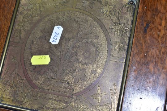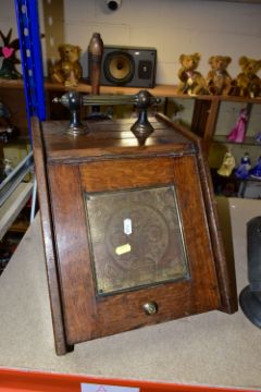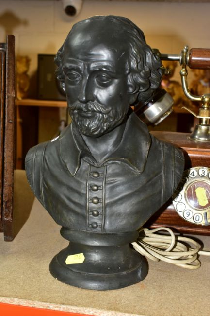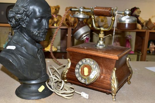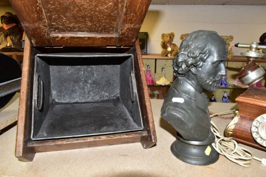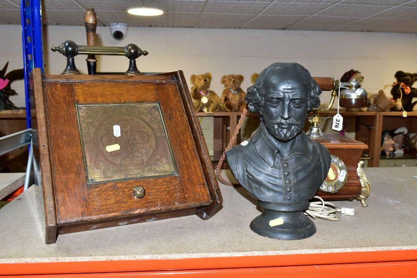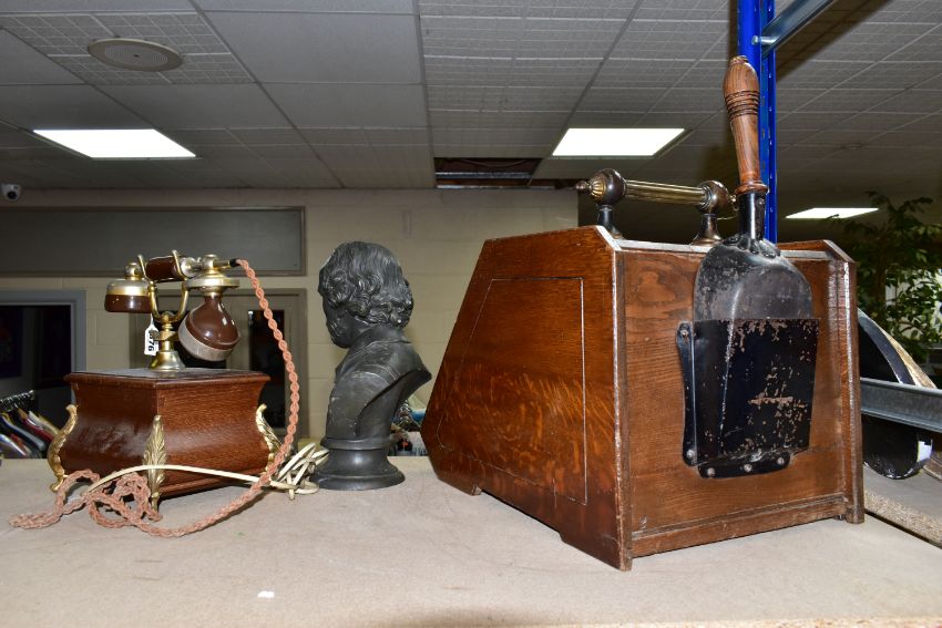 A VICTORIAN COAL PURDONIUM WITH TIN LINER AND SHOVEL, with an applied brass panel decorated with flowers and birds, a BT approved reproduction dial phone, plug-in BT label on base, made in Italy Schooner-TSR 8028A, together with a bronzed composite bust of Shakespeare, height 31cm (3) (Condition report: the phone is not tested, purdonium brass panel and handle are worn)