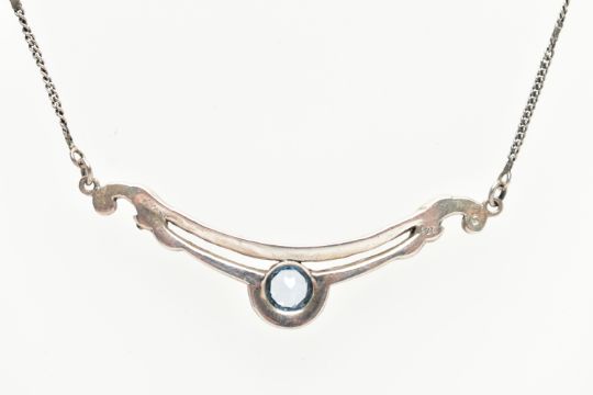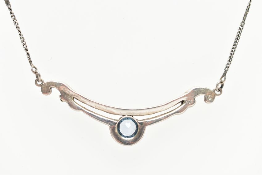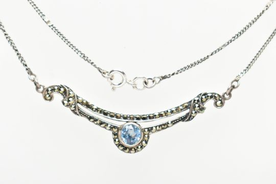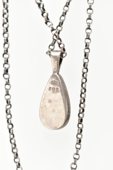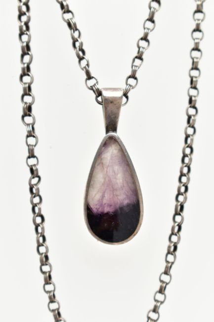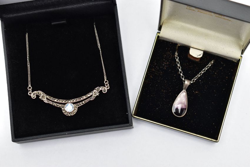 A SILVER BLUE JOHN PENDANT AND WHITE METAL GEMSET NECKLACE, tear drop Blue John, displaying deep purple banding, collet set in a plain silver setting, hallmarked 'CWS' Sheffield 1990, approximate gross weight 3.7 grams, suspended from a white metal belcher chain, approximate length 475mm, fitted with a base metal clasp, together with a centrally set circular cut topaz, with accent marcasite stones on a scrolling pendant, fitted with a fine curb chain, fitted with a spring clasp, stamped 925, approximate gross weight 6.2 grams (condition report: general moderate wear, would benefit from a gentle clean and polish)