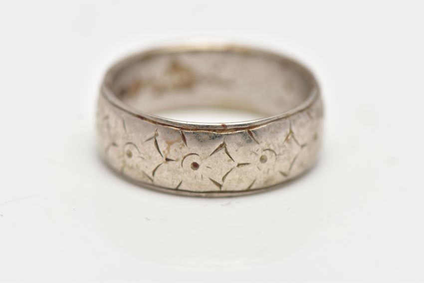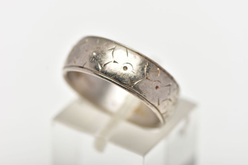 A WHITE METAL WIDE BAND RING, featuring a worn floral engraving, approximate width 6.1mm, stamped 18ct, ring size leading edge N, approximate gross weight 8.2 grams (condition report: worn engraving, would benefit from a gentle clean)