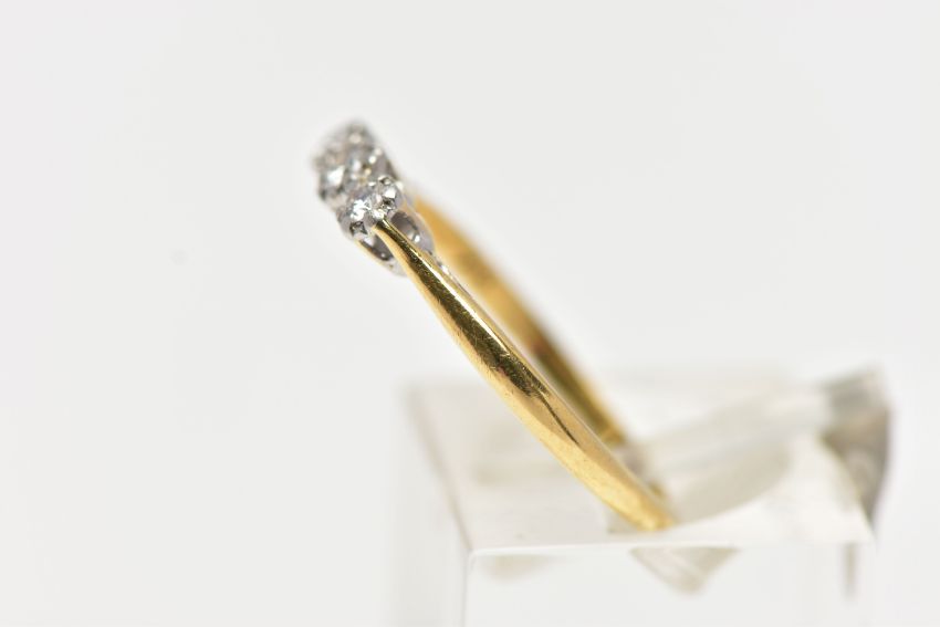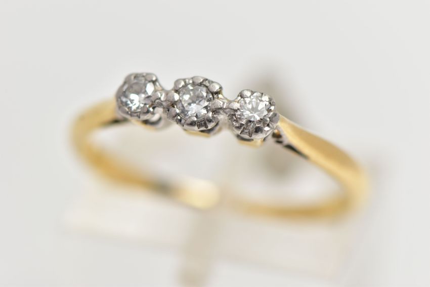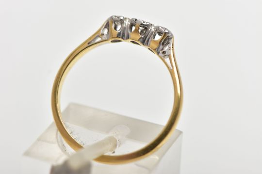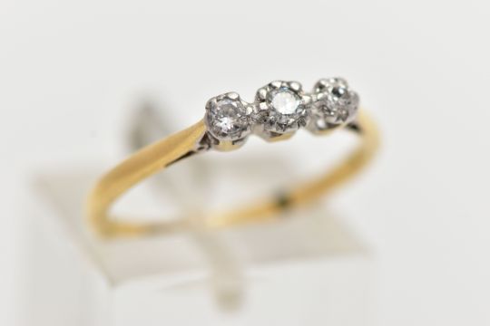 A YELLOW AND WHITE METAL THREE STONE DIAMOND RING, three illusion set round brilliant cut diamonds, estimated total diamond weight 0.10cts, pinched shoulders leading onto a polished band, stamped '18ct & Plat', ring size N, approximate gross weight 2.1 grams