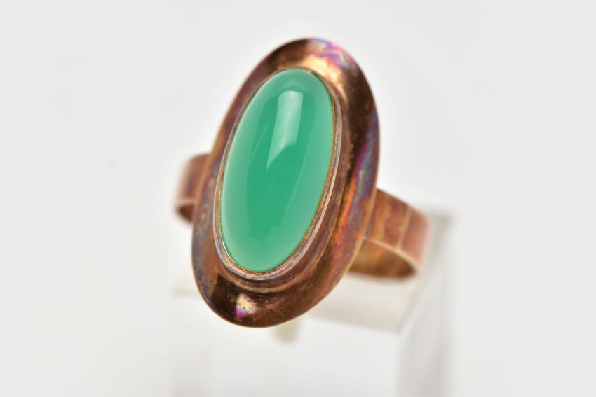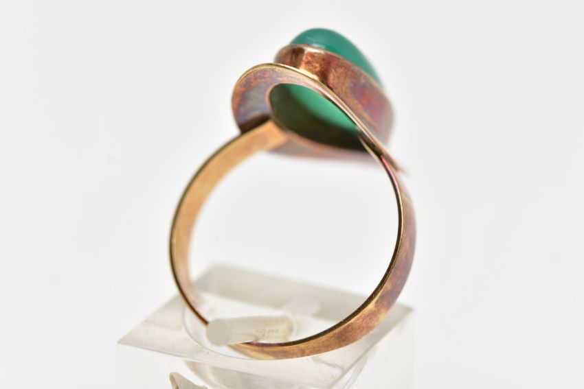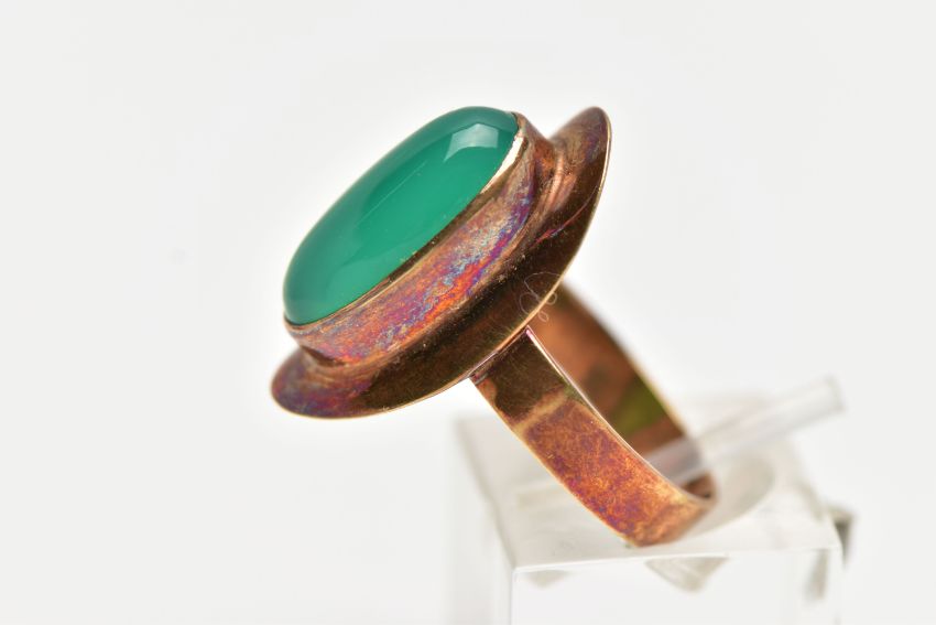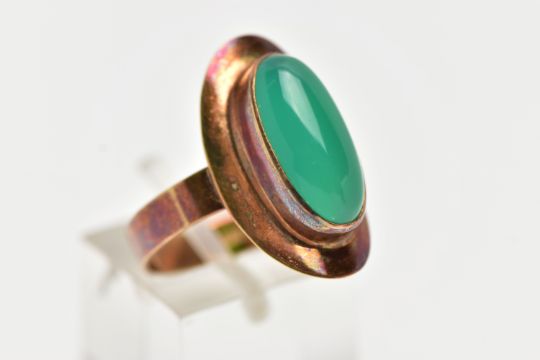 A YELLOW METAL MID 20TH CENTURY 1970s DYED CHALCEDONY RING, set with an oval dyed green Chalcedony, bezel set, within a plain polished surround, stamped 585, ring size R, approximate gross weight 4.5 grams (condition report: overall condition good, ring tarnished)