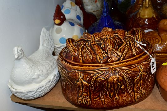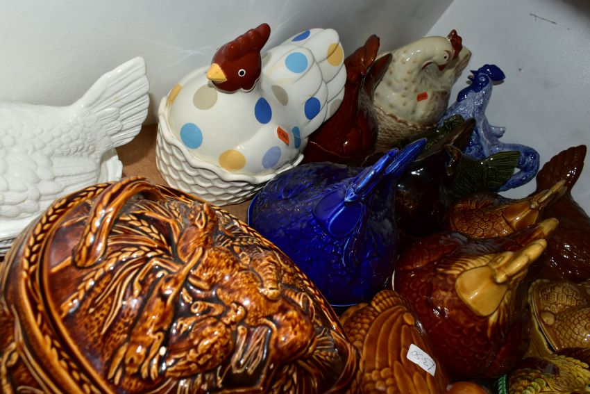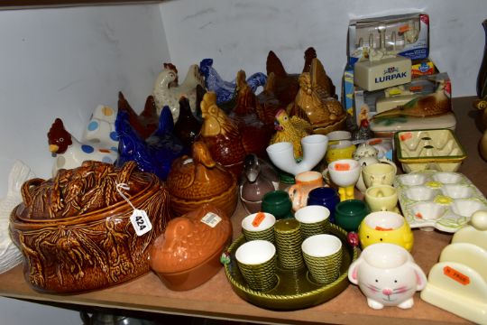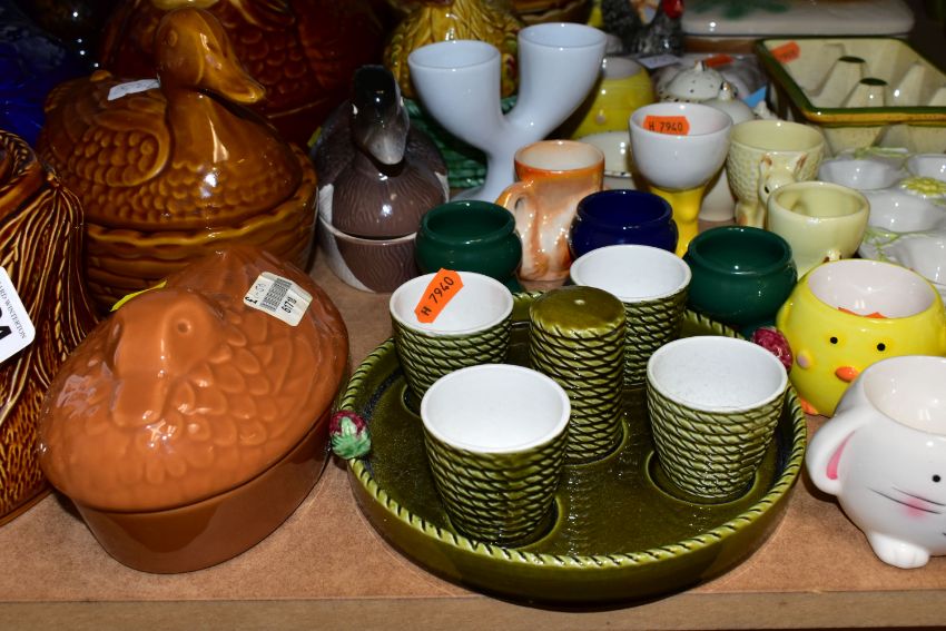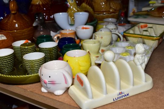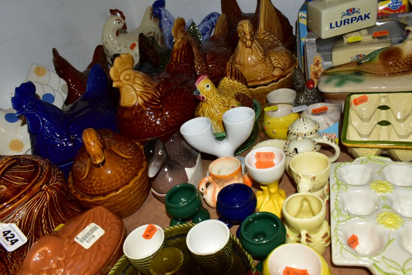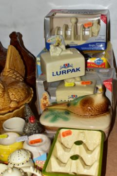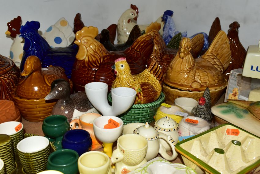 A GROUP OF CHICKEN AND EGG THEMED CERAMICS, to include thirteen hen on nest dishes, by makers including Portmeirion, three similar duck on nest dishes, a brown glazed Portmeirion game pie dish and cover, a boxed Lurpak toast rack and butter dish, a boxed St Ivel Utterly Butterly dish, a Crown Ducal cruet set, assorted egg cups, etc (Qty) (Condition report: most pieces appear in good condition, one butter dish missing base, sd)