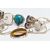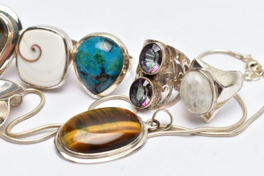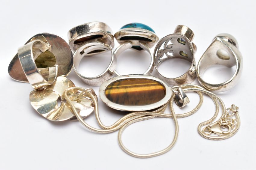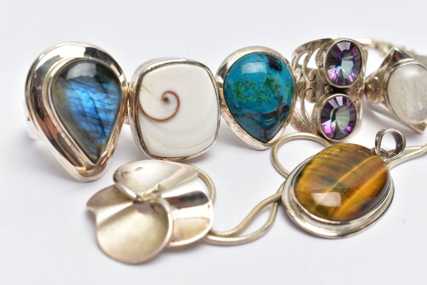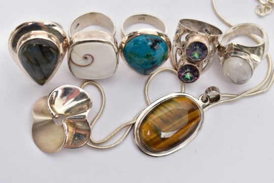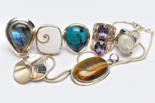 AN ASSORTMENT OF LARGE STATEMENT WHITE METAL AND SEMI PRECIOUS JEWELLERY, to include a two stone mystic topaz ring, a moonstone ring, a labradorite ring, a tigers eye pendant, a operculum ring, a azurite ring, a white metal floral pendant fitted with a white metal chain, stamped 925, approximate gross weight 92.7 grams, (condition report: general moderate wear, light scratches to the white metal, stones in very good condition)