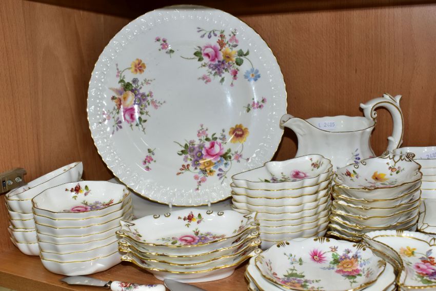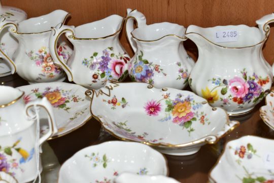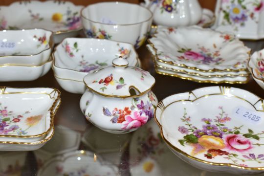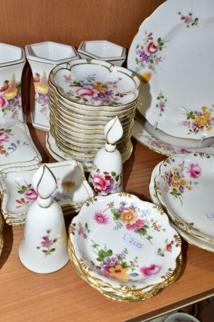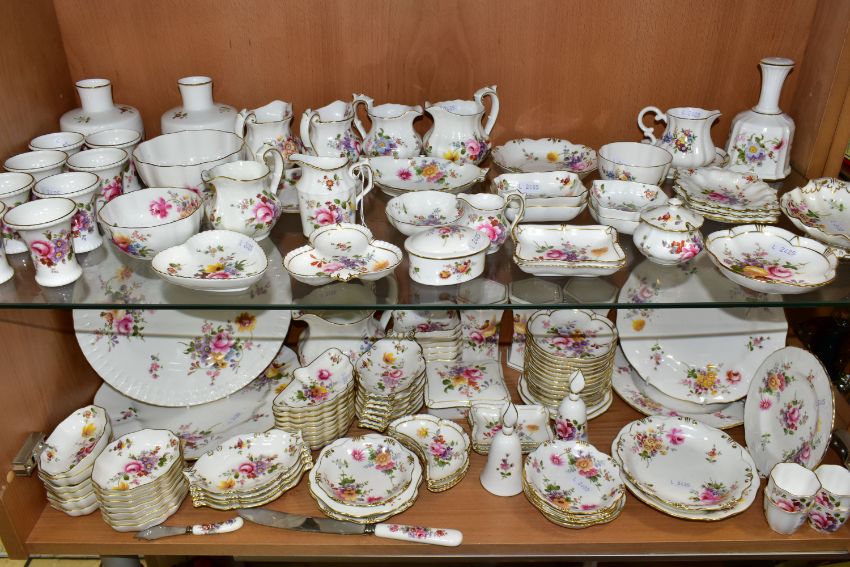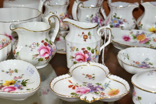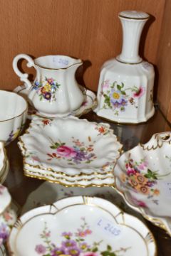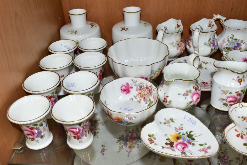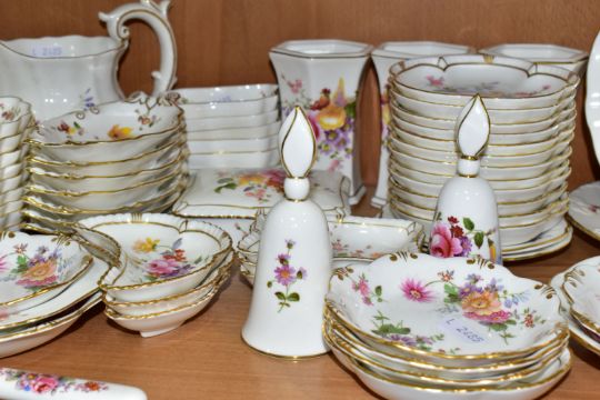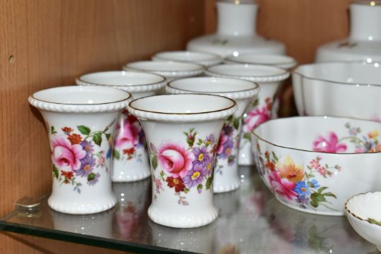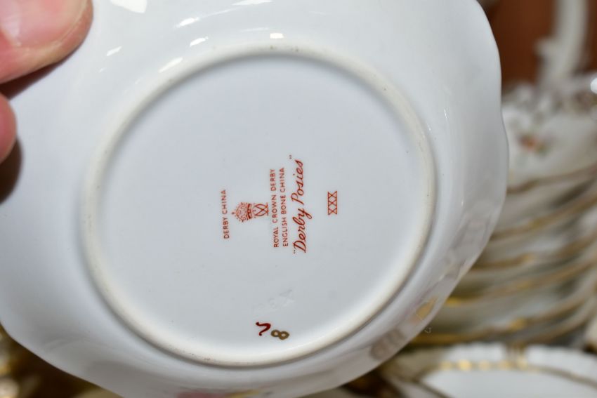 A QUANTITY OF ROYAL CROWN DERBY 'DERBY POSIES' PATTERN GIFT WARE, comprising jugs, preserve pots, pin dishes, egg cups, bells, milk jugs, vases, bud vases, cake knife, cake plates, cheese knife, miniature vases, etc (Qty) (Condition report: good, no obvious signs of damage)