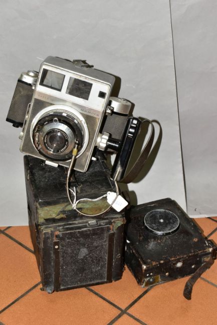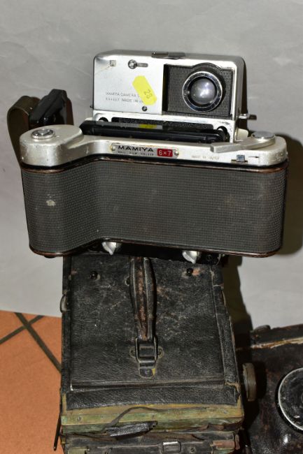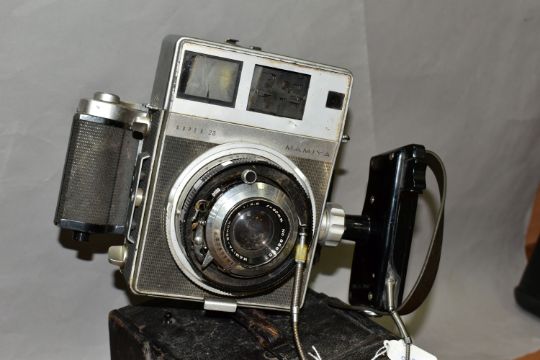 AN ADAMS AND CO MINEX REFLEX DELUXE FILM CAMERA ideal for restoration( no lens or lens carrier), a Mamiya Super 23 Film Camera with a Mamiya 6x7 roll film holder and a Carl Zeiss Jena Minimum Palmos film camera ( all ideal for restoration and fairly complete unless stated)