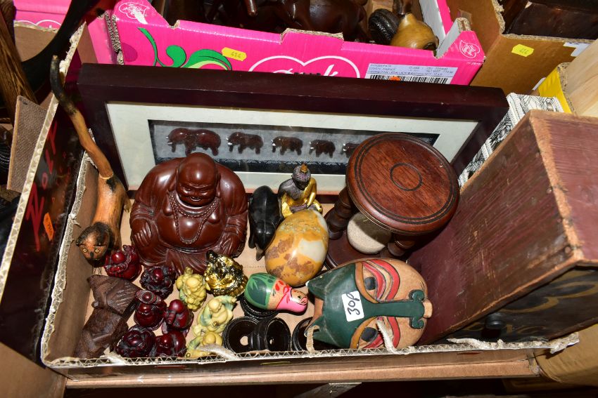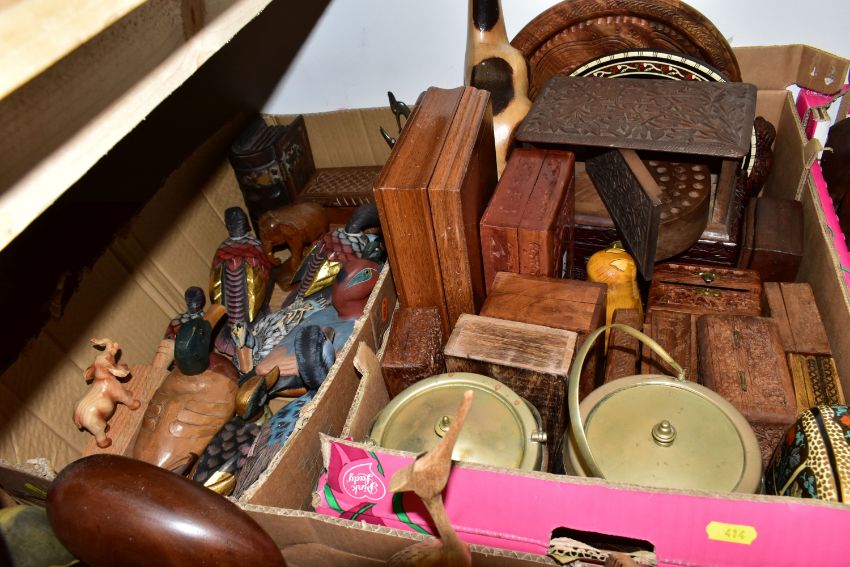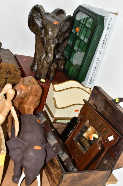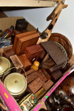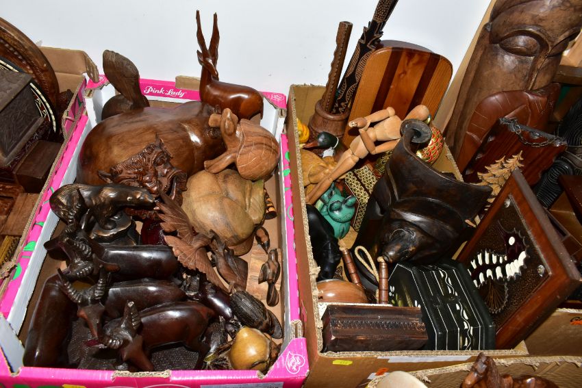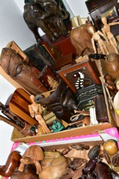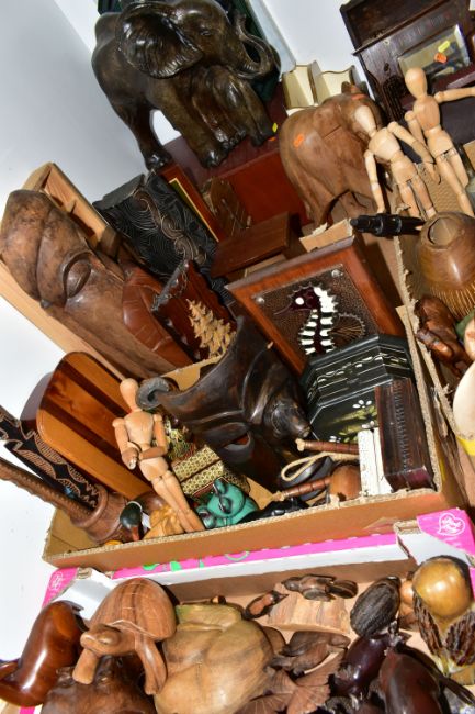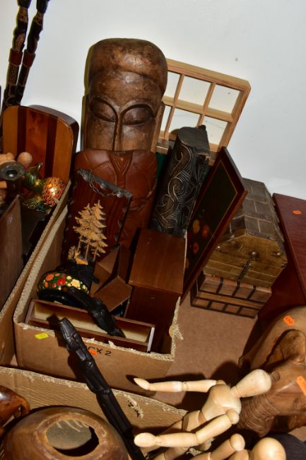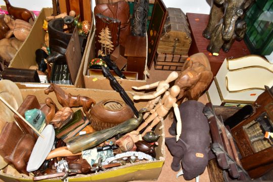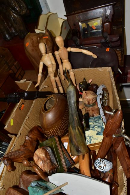 EIGHT BOXES AND LOOSE TREEN, to include carved animals and birds, some painted, decorative masks and figures, various boxes, book ends, an hour glass, a mirror, biscuit barrels, vases, display shelves and artist's mannequins, including vintage, modern, tourist and tribal art, etc (8 boxes + loose) (sd)