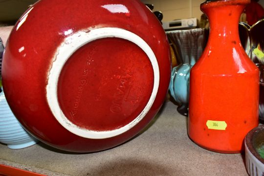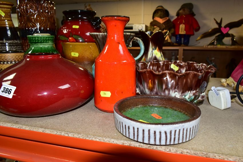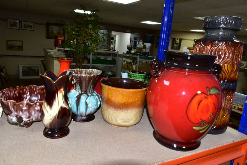 A QUANTITY OF GERMAN / WEST GERMAN POTTERY, to include an orange Bay Keramic vase pattern 68 approximate height 20cm, orange and green Bay Keramic vase pattern 660 approximate height 17cm, brown toned Scheurich Keramic vase pattern 293 approximate height 30cm, globular vase with ribbed body - chip to the rim, Steuler shallow bowl with green crackle glaze to the inside, together with other vases, jugs, plant pots etc