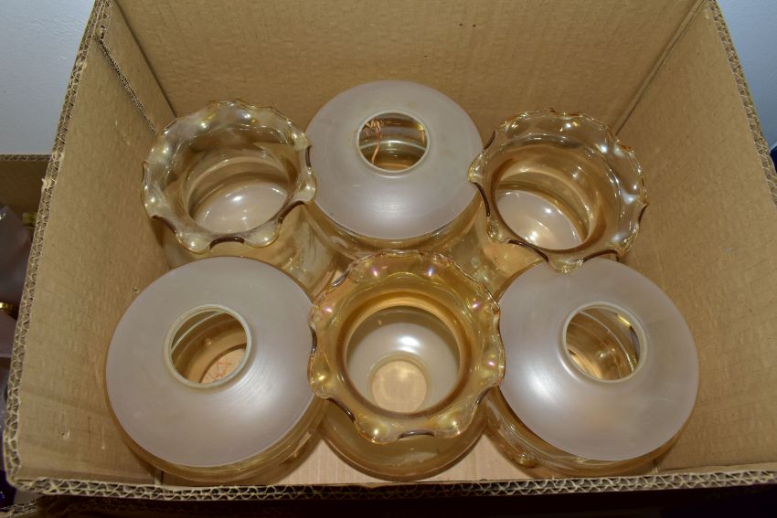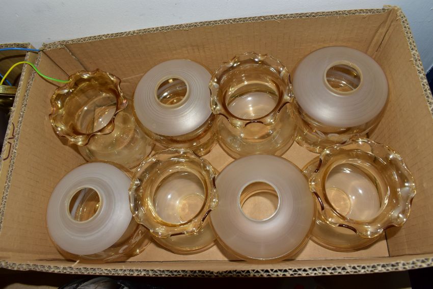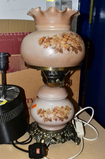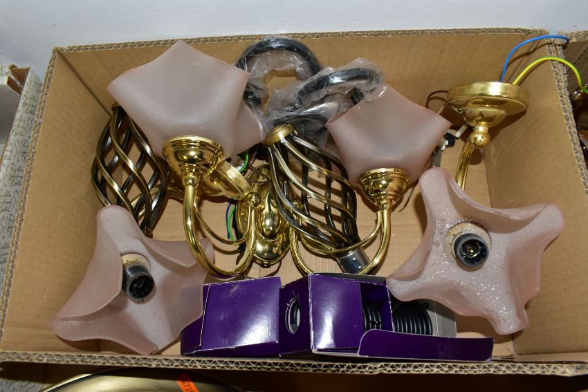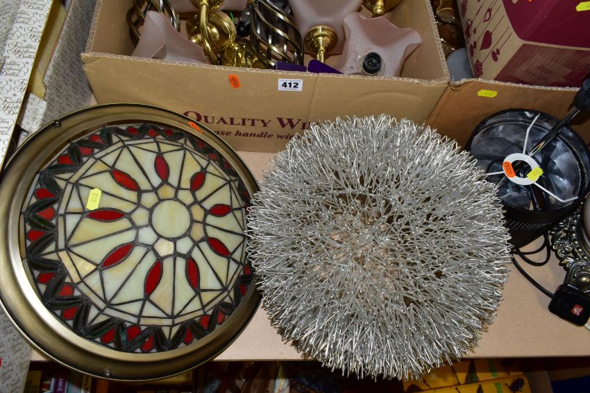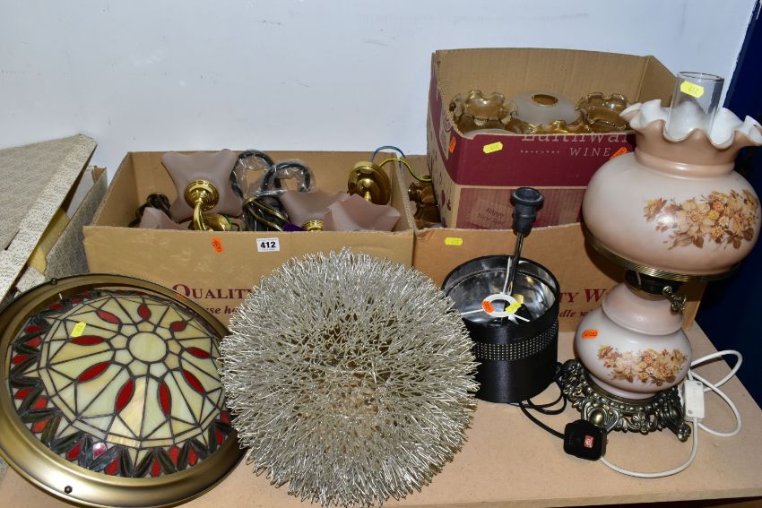 THREE BOXES AND LOOSE LAMPS, LIGHT FITTING AND LAMPSHADES, to include two table lamps of modern and traditional styles, a wire ceiling shade, a leaded glass uplighter pendant lightshade, total diameter 35cm, four brass finish wall light fittings with pink shades, two boxes of glass shades, etc (3 boxes + loose) (sd, untested)