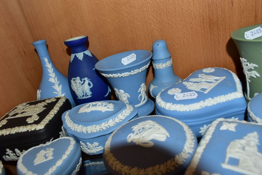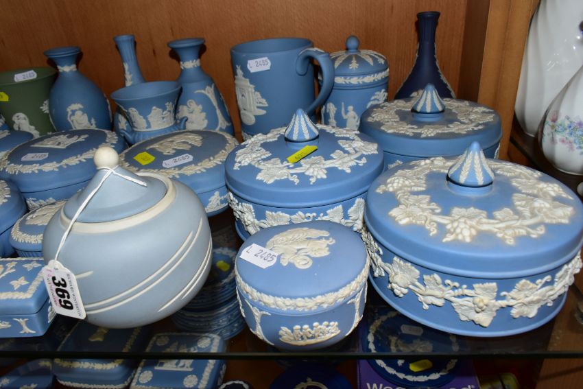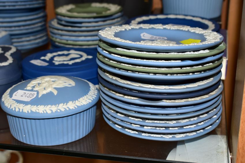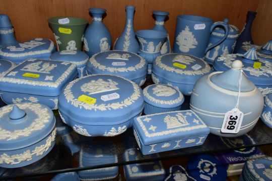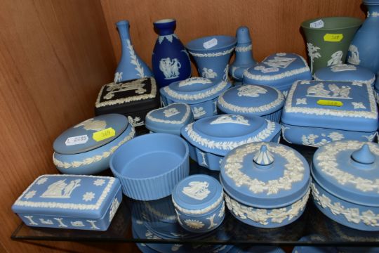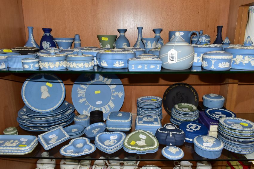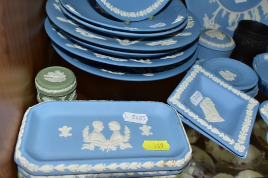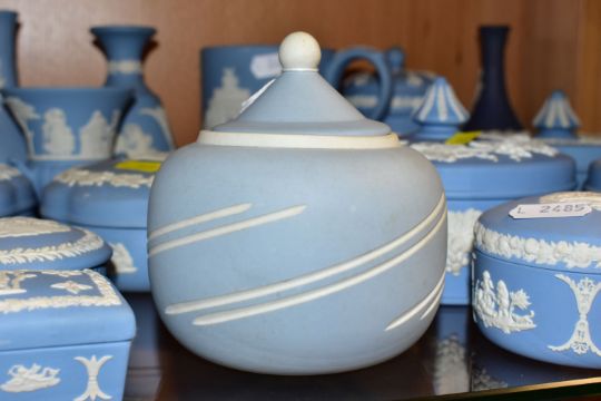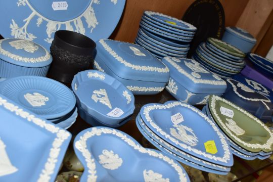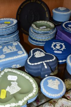 A LARGE QUANTITY OF WEDGWOOD BLUE JASPER GIFT WARE, comprising a modern pale blue lidded pot- W40100, blue Jasper Ware pots, pin dishes, bud vases and plates, black Jasper Ware pot, square lidded box, a black Jasper Ware commemorative plate for the 1972 Munich Olympics, several heart shaped blue pin dishes, spade shaped boxes and pin dishes, etc (Qty) (Condition report: no obvious damage, some older pieces would benefit from a clean)