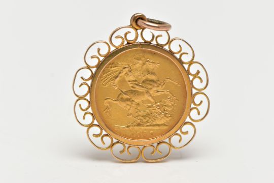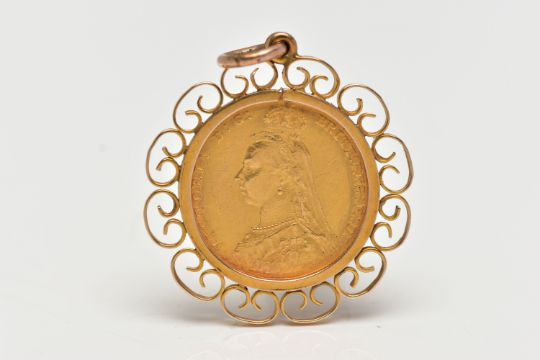 A FULL SOVEREIGN COIN PENDANT, the coin dated 1887, within an openwork scroll surround, pendant mount stamped 9ct gold to side, approximate length of pendant (including surmount) 39mm, approximate gross weight 11.5 grams (condition report: overall condition good, minor light scratches in keeping with general wear)