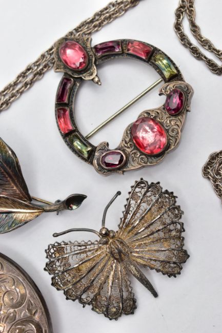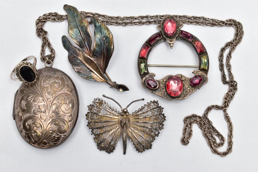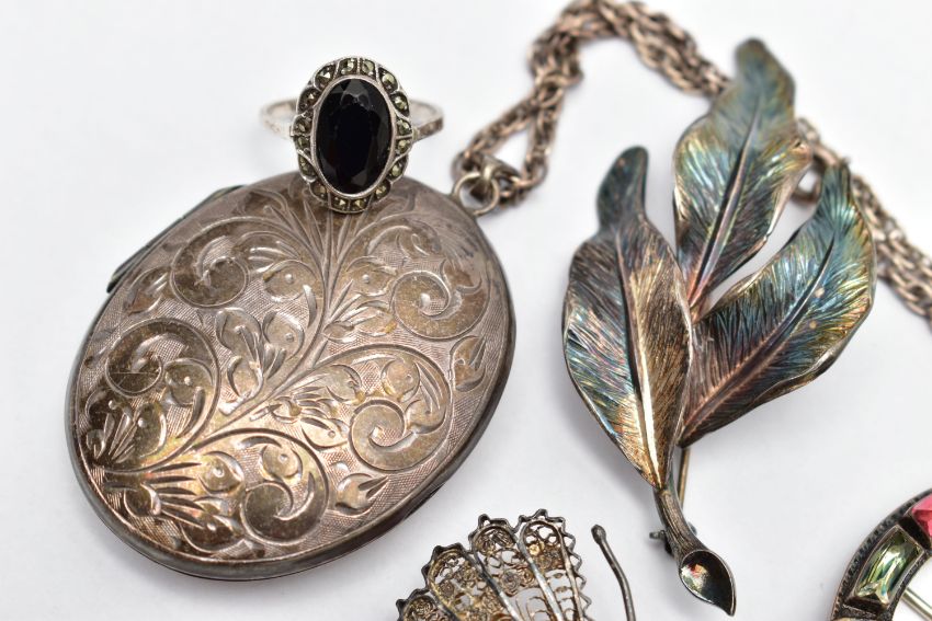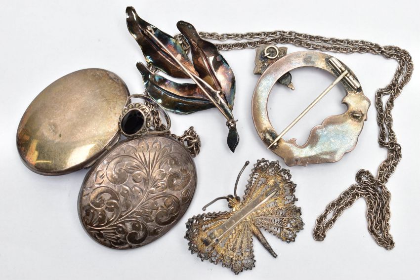 AN ASSORTMENT OF SILVER AND WHITE METAL JEWELLERY, to include a large silver locket, oval form, engraved with a foliage design, fitted with a tapered bail, approximate length 53mm, hallmarked Birmingham 1977, a silver brooch, designed as three leaves, fitted with a safety clasp, approximate length 68mm, hallmarked London import 1976, approximate gross weight 26.8 grams, a white metal Scottish Celtic brooch, set with coloured paste stones, fitted with a C clasp, a white metal onyx and marcasite ring, a white metal butterfly brooch with filigree detail, a white metal chain necklace, all unmarked, approximate gross weight 47.3 gram (condition report: general moderate wear, overall condition good)