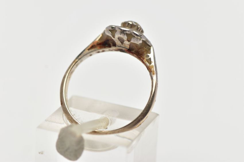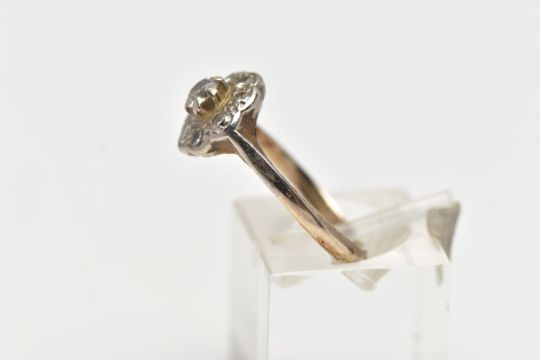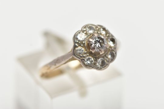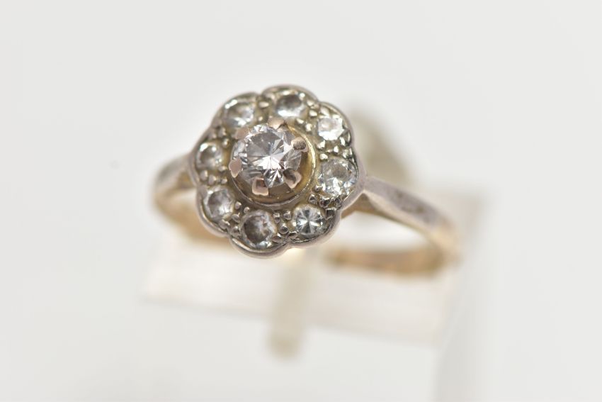 A WHITE METAL DIAMOND CLUSTER RING, of a flower shape, set with nine round brilliant cut diamonds, estimated total diamond weight 0.50cts, to a polished white metal band, stamped 750, ring size L, approximate gross weight 3.4 grams (condition report: would benefit from a clean, all diamonds are secure, general light wear)