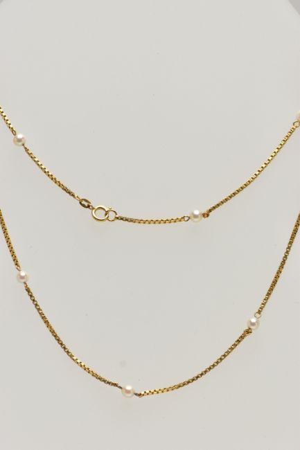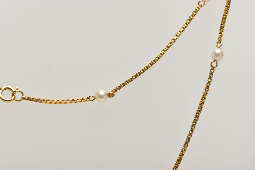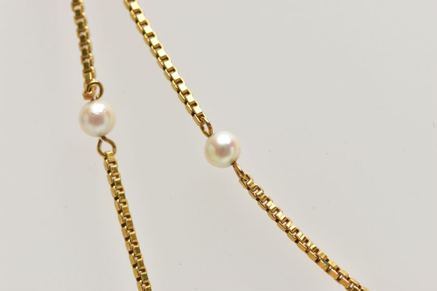 A YELLOW METAL CULTURED PEARL NECKLACE, designed as a series of freshwater cultured pearls, to the box link chain and spring clasp, stamped 585, approximate length 680mm, approximate gross weight 10.9 grams (condition report: overall condition very good)