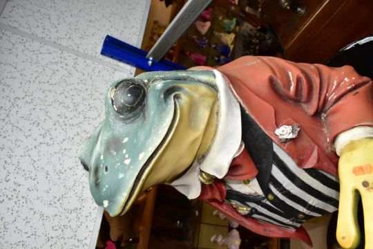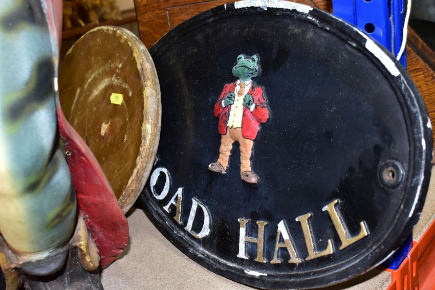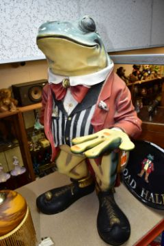 A LARGE RESIN FIGURE OF A TOAD HOLDING A SERVING TRAY, approximate height 75cm together with a cast metal plaque titled Toad Hall with a relief toad figure to the middle (serving tray is loose)