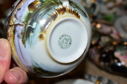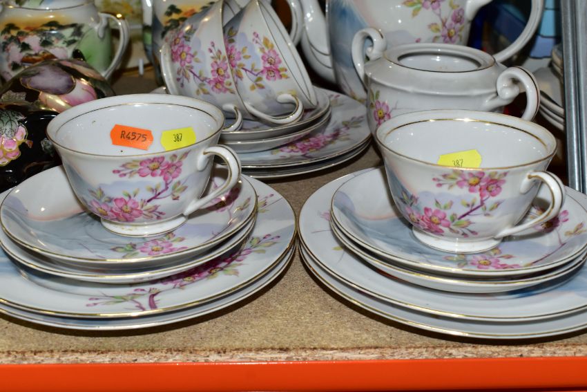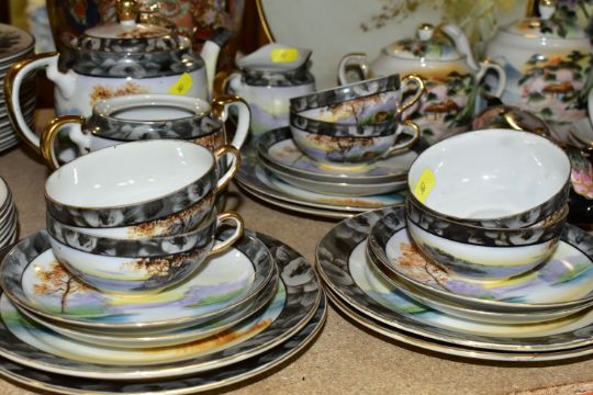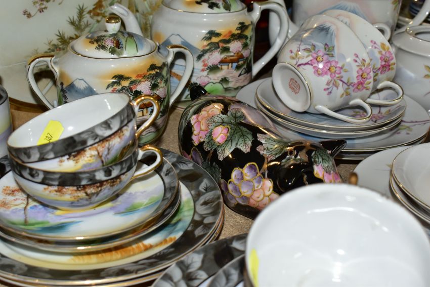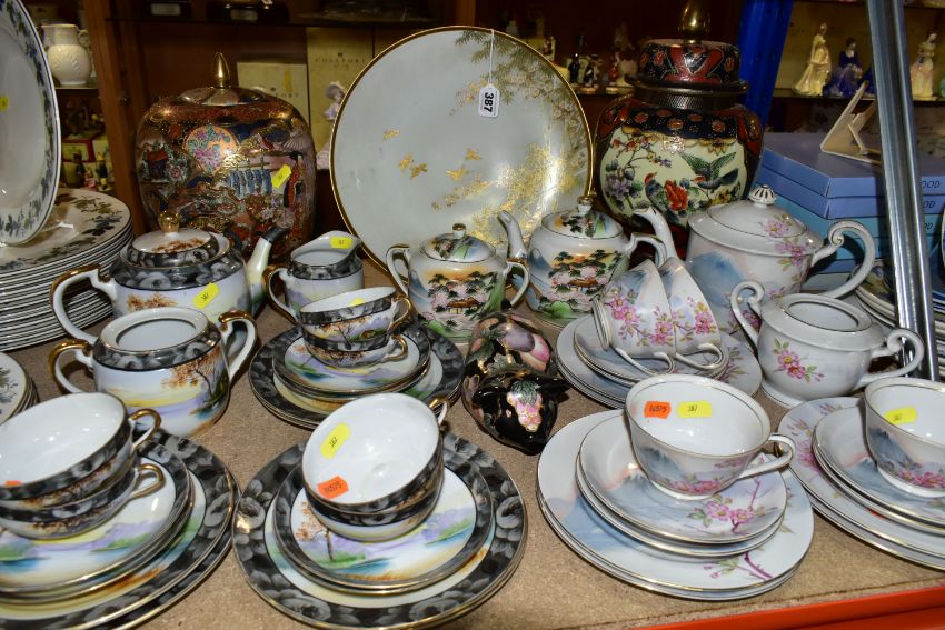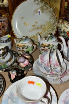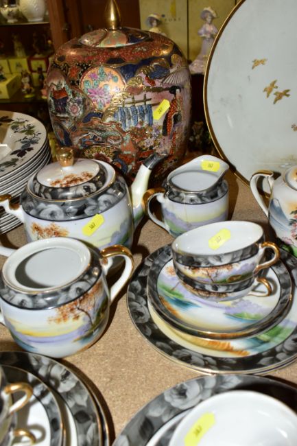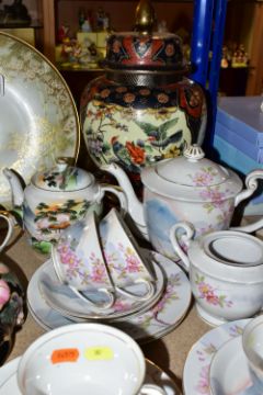 A QUANTITY OF ORIENTAL CERAMICS, comprising a footed charger decorated with a scene a of a cherry blossom tree and birds, signed Kamiyama to the base, approximate diameter 31cm, a satsuma vase with cover decorated with a repeat scene of two Geisha in a garden, a Chinese swollen baluster vase with cover and wooden stand, the vase decorated with three panels of exotic birds, approximate height excluding stand, Sone China Japanese tea wares, hand painted tea wares signed to the base and a pig decorated with a fruit and vine pattern, chips and losses to the tea wares