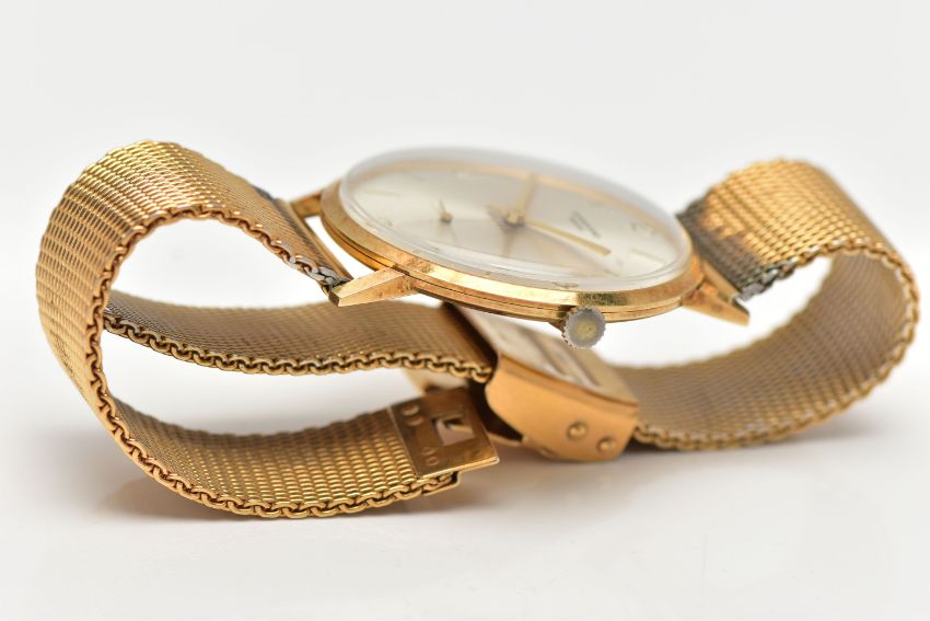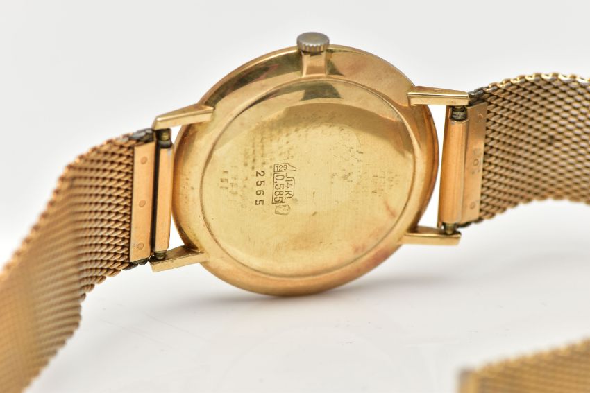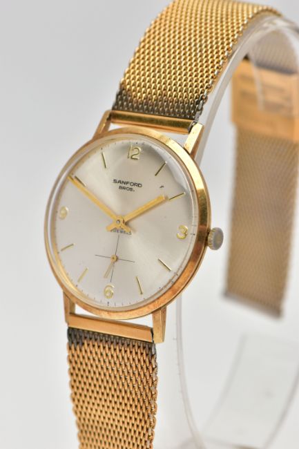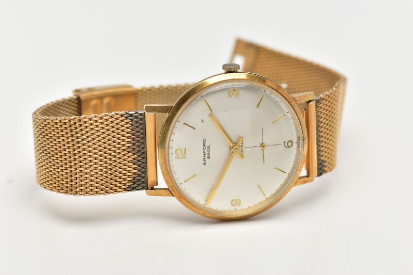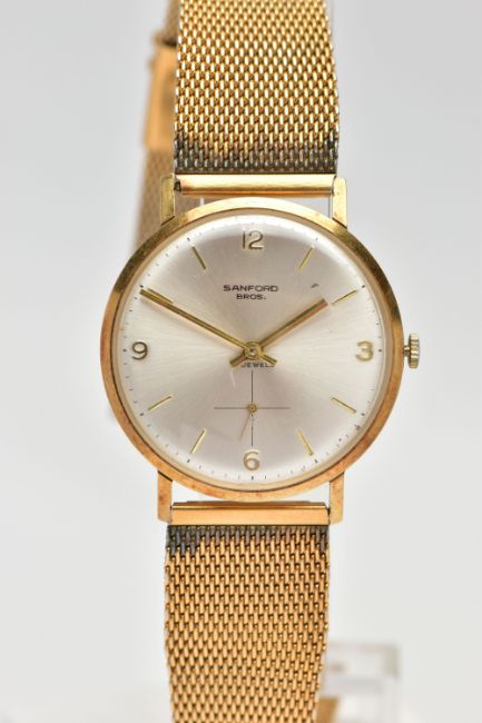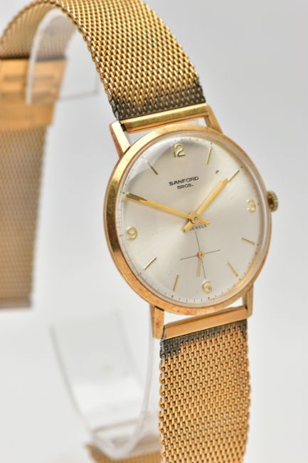 A 'SANFORD' 14CT GOLD WRIST WATCH, hand wound movement, silver round dial, Arabic numbering at the three, six, nine and twelve o'clock position, interspaced with baton markers, subsidiary dial at the six o'clock position, polished gold case, approximate case width 34mm, case back stamped 14k, Swiss control mark, 2565, inside case back hallmarked 14ct London import 1966, fitted with a gold plated mesh bracelet, approximate gross weight, including movement 51.7, (condition report: general moderate wear, currently working, time keeping not tested, wear to plating on bracelet)