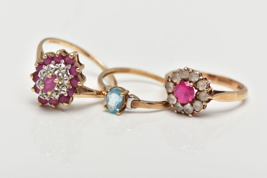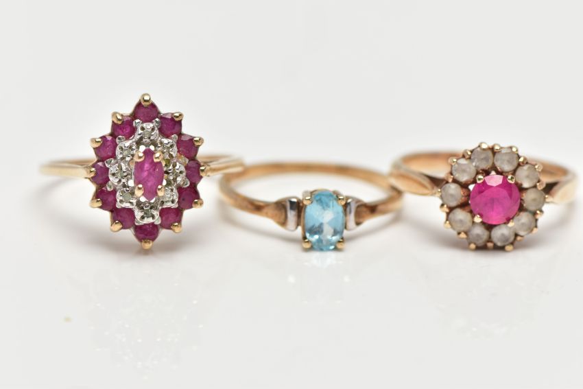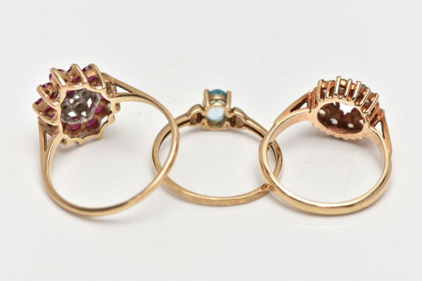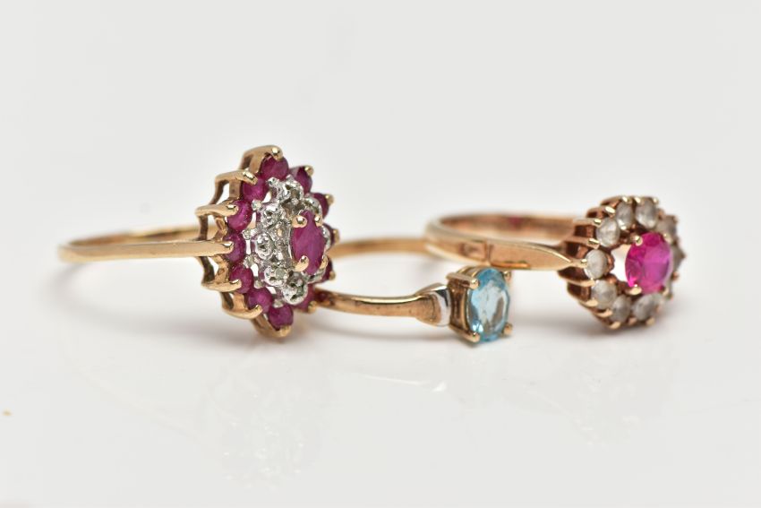 THREE GEM SET RINGS, the first designed as a tiered marquise shape cluster set with rubies and diamonds, polished band, hallmarked 9ct London import, ring size P, the second a circular cluster set with a synthetic ruby within a surround of colourless spinels, pinched shoulders leading onto a polished band, hallmarked 9ct Birmingham, ring size M, the third set with an oval cut pale blue paste, four claw set into a yellow metal mount and polished band, stamped 9ct, ring size M 1/2, approximate gross weight 6.4 grams