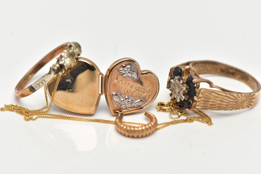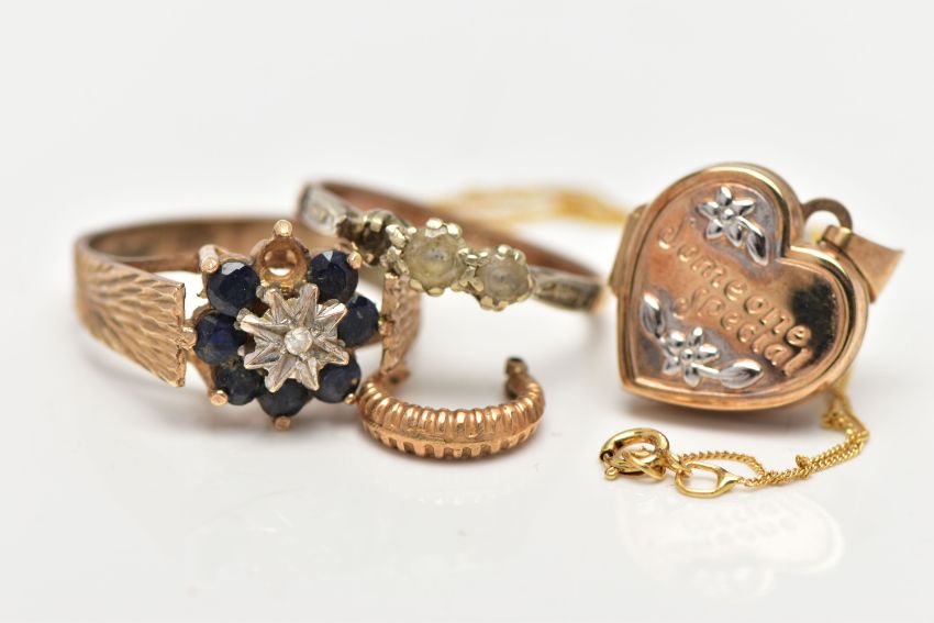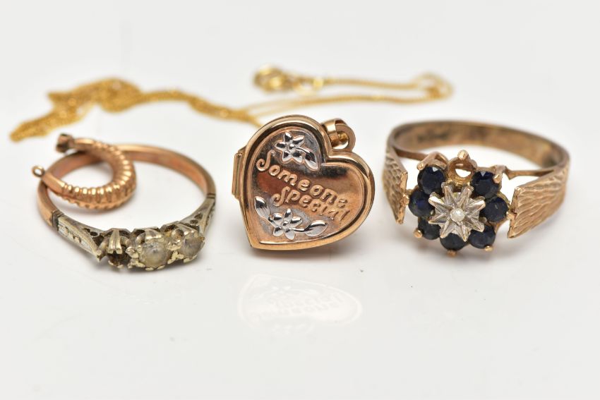 AN ASSORTMENT OF 9CT GOLD AND YELLOW METAL JEWELERY, to include a 9ct gold heart locket with floral detail, embossed with the words 'Someone Special' suspended from a fine curb link chain, fitted with a spring clasp, hallmarked 9ct Birmingham, a 9ct gold cluster ring, centrally set with a single round brilliant cut diamond, within a surround of circular cut blue sapphires, leading on to a wide textured band, hallmarked 9ct London, ring size N leading edge, approximate gross weight 5.5 grams, together with an AF three stone yellow metal ring, stamped 9ct, an AF single earring, unmarked, approximate gross weight 2.3 grams (condition report: general moderate wear, one sapphire missing from ring, one stone missing from second ring, earring broken)