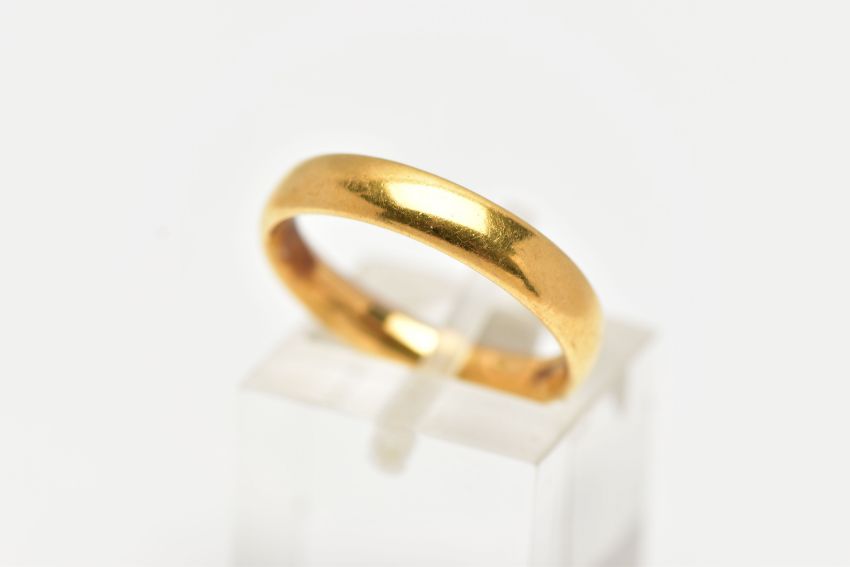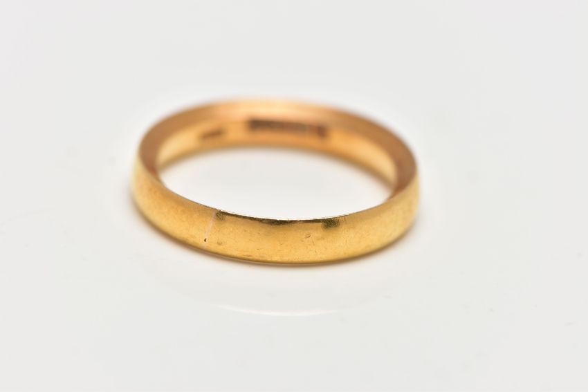 A 22CT GOLD BAND RING, plain polished band yellow gold, one inside edge chamfered, approximate dimensions 3.5mm width x 2mm depth, hallmarked 22ct Birmingham 1935, approximate gross weight 4.9 grams, (condition report: general moderate wear, overall condition good)