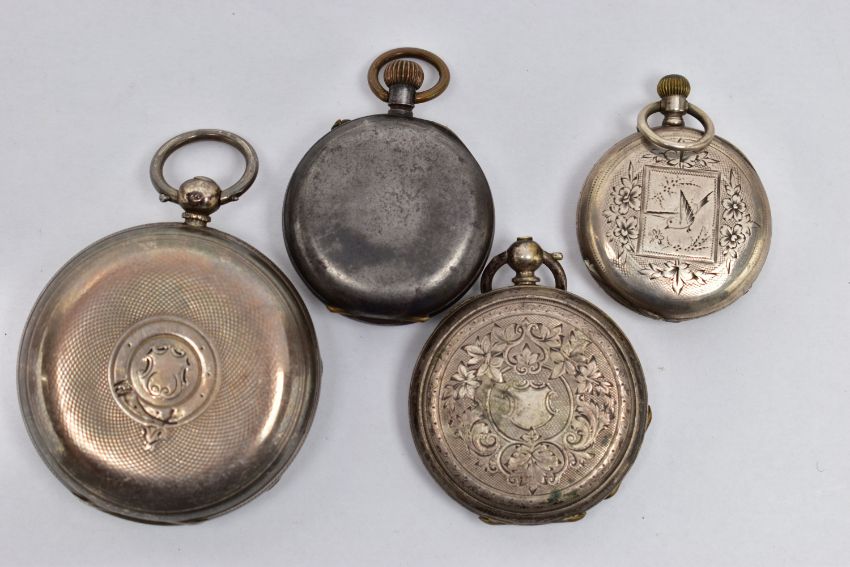 FOUR OPEN FACE POCKET WATCHES, the first a key wound movement, Roman numerals, subsidiary second dial at the six o'clock position, engine turned pattern and vacant cartouche, approximate case width 49mm, inside case back and dust cover hallmarked 'Joseph Harris Elliott' Chester 1861, approximate gross weight 99.5 grams, the second a key wound movement, Roman numerals, foliage engraved pattern with vacant cartouche, approximate case width 39mm, inside case back stamped fine silver, the third a hand wound movement, Roman numerals, floral engraving with a bird, approximate case width 32mm, inside case back engraved 'Cylindre Bornand Geneve Aemontoia 10 rubis' approximate gross weight 65.1 grams, together with a white metal hand wound pocket watch, inside case back stamped ' beaucort' (condition report: general moderate wear, watches untested)