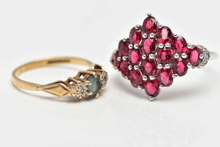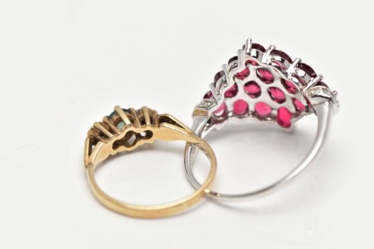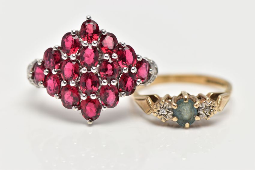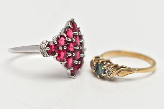 TWO GEM SET RINGS, the first a large marquise shape ring set with sixteen oval cut garnets, each in a shared claw setting, single cut diamond detailed shoulders leading onto a polished white gold band, hallmarked 9ct Birmingham, ring size R, the second set with an oval cut topaz, flanked with illusion set, single cut diamonds, textured shape shoulders leading onto a polished band, hallmarked 9ct Birmingham, ring size K, approximate gross weight 5.9 grams