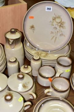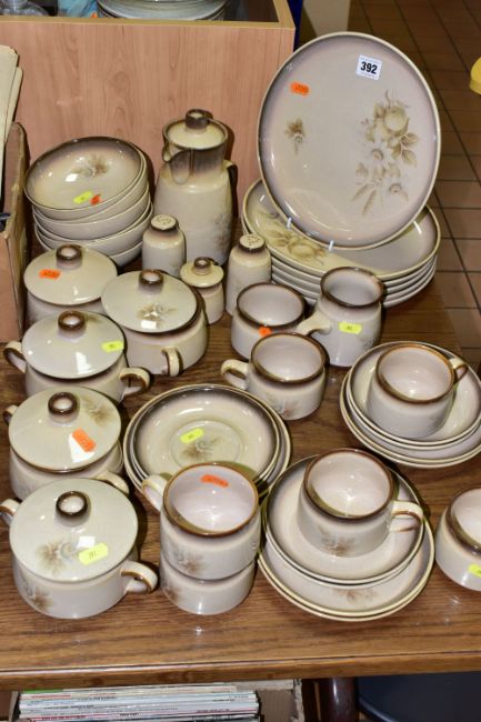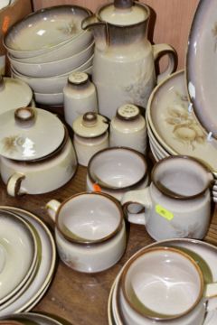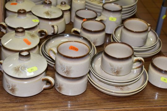 DENBY MEMORIES SIX PLACE DINNER SET, comprising dinner plates, breakfast bowls, coffee pot, cups, saucers, side plates, milk jug, sugar bowl, salt & pepper pots, mustard pot, and five covered soup bowls, Condition: signs of light use, no obvious chips or cracks