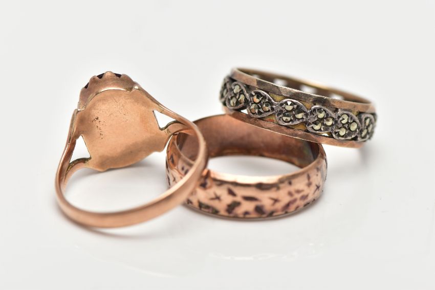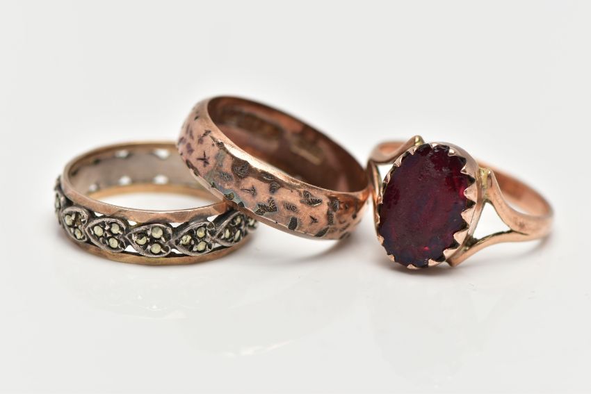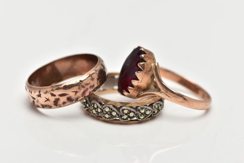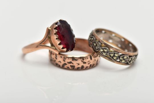 A 9CT GOLD RING AND TWO YELLOW METAL RINGS, the first a textured band ring, approximate dimensions 6mm width x 1.5mm depth, hallmarked 9ct Birmingham 1897, approximate gross weight 3.7 grams, a yellow metal ring, set with red paste in a closed back setting, bifurcated shoulders and polished band, stamped 9ct, ring size O, a yellow and white metal ring set with circular cut marcasite stones, stamped 9ct & sill, ring size N center, approximate gross weight 6.2 grams, (condition report: general moderate wear, paste stone heavily abraded)