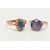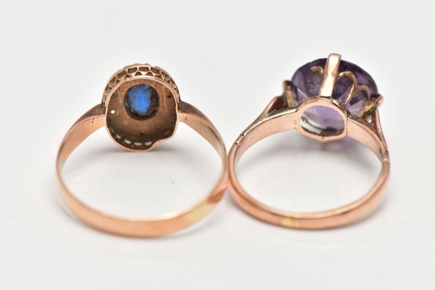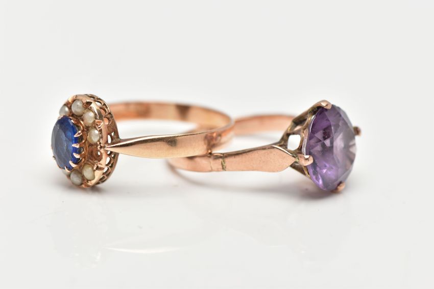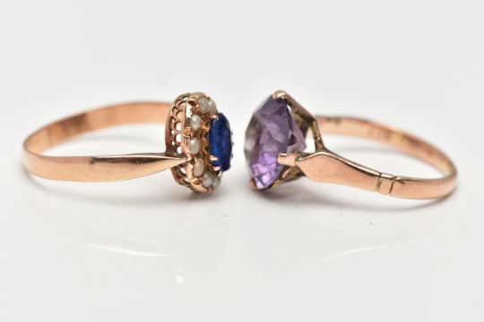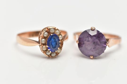 TWO YELLOW METAL GEMSET RINGS, the first a single stone ring, prong set with a circular cut synthetic colour change sapphire, shank stamped 9ct, ring size M, approximate gross weight 3.4 grams, the second ring a bright blue oval cut gem stone, set with a surround of small imitation pearls, unmarked, ring size Q 1/2, approximate gross weight 2.6 grams (condition report: general moderate wear, first ring the stone loose in setting, second ring, central stone abraded with surface reaching fractures, one imitation pearl missing)