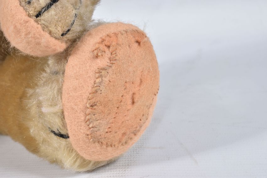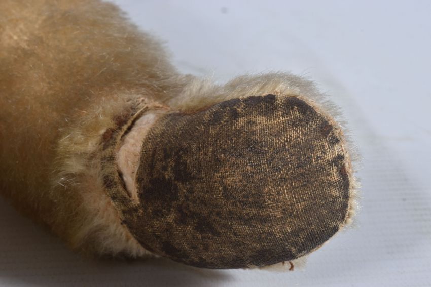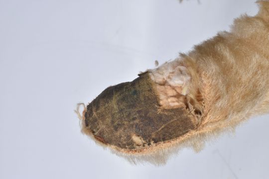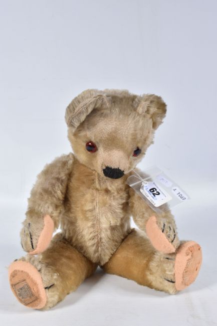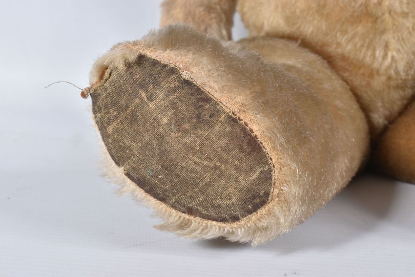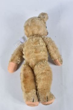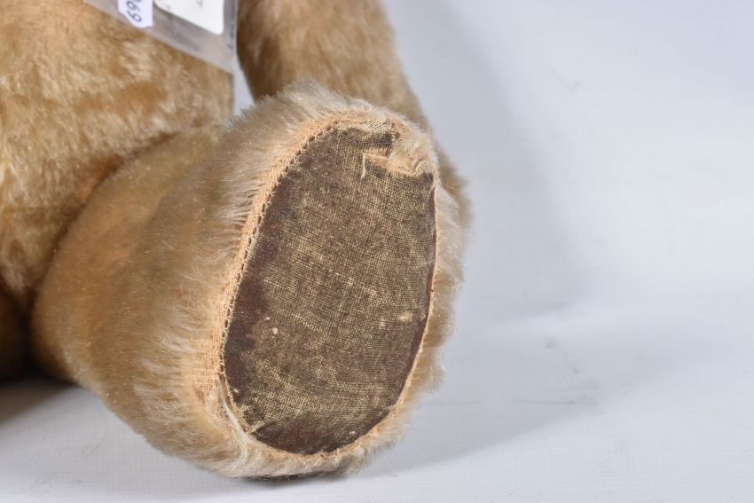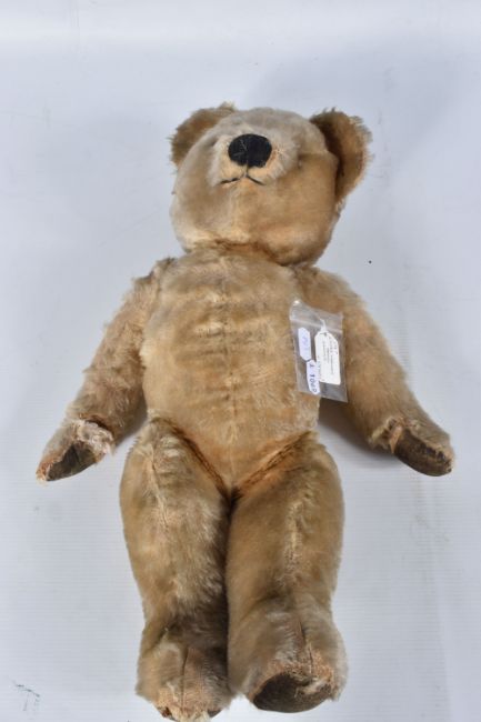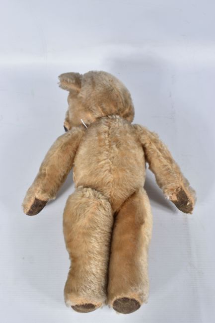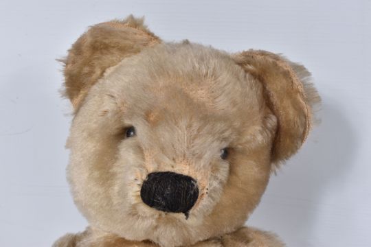 A CHAD VALLEY BLONDE MOHAIR TEDDY BEAR, amber and black glass eyes, shaved muzzle, vertical stitched nose, jointed body, original claws, kapok stuffing, replacement felt pads with part original pads and label to feet, label is version 'Toymakers to H.M. The Queen' so dated c.1938- 1952, squeaker not working, good condition with some fur loss and wear, height approx. 41cm, with a similar larger bear, c.1940's possibly Chad Valley but not marked, original black boot button eyes, vertically stitched nose, jointed body, original Rexine pads to hands and feet, kapok or sub stuffing, growler not working, in good condition but has some damage, fur loss and wear, height approx., 49cm (2)