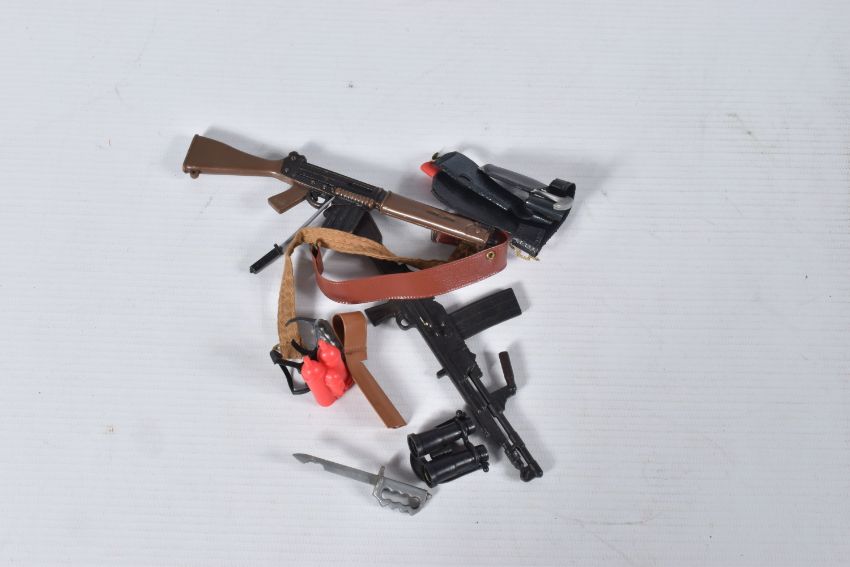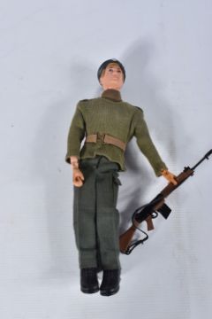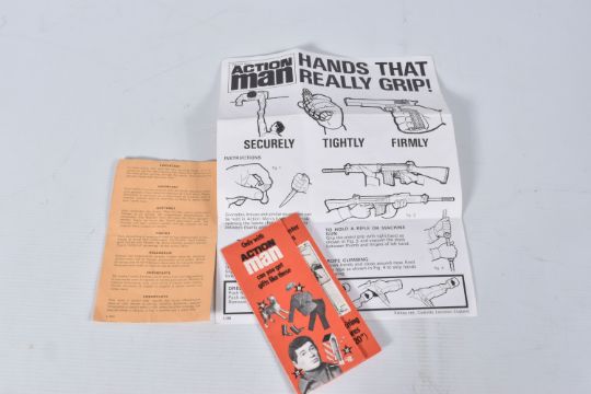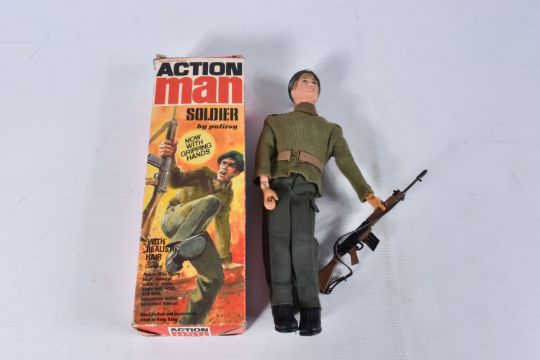 A BOXED PALITOY ACTION MAN SOLDIER FIGURE, No.34052, figure with fair flock hair and gripping hands which have some discolouration, complete with all parts of his uniform, SLR rifle, cap/thimble for dressing and instruction leaflets, missing equipment manual but comes with Star collection card, figure and clothing all in very good condition, box complete but has some damage and wear, with a small quantity of loose accessories