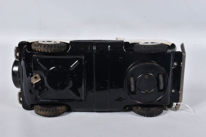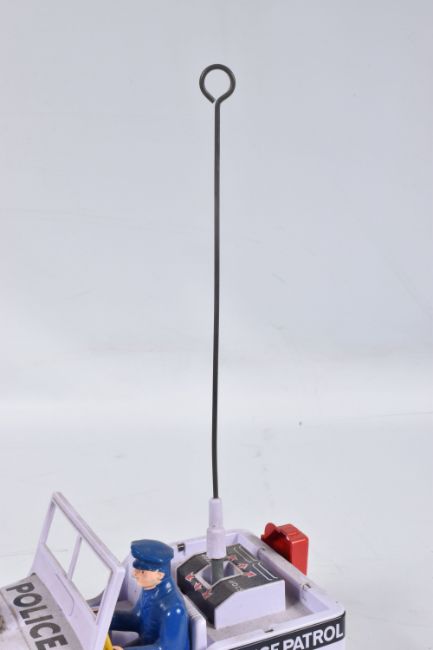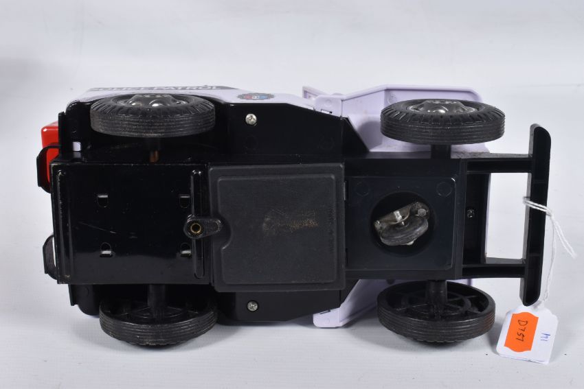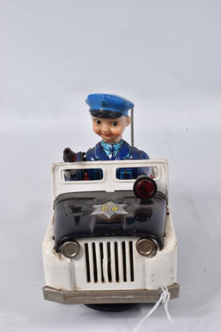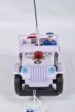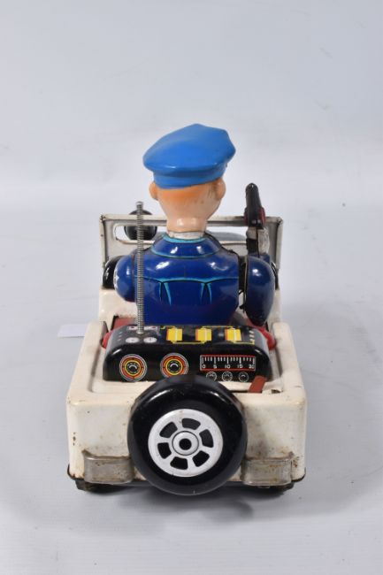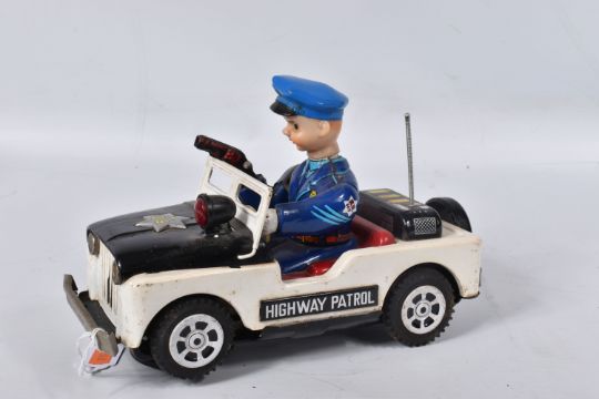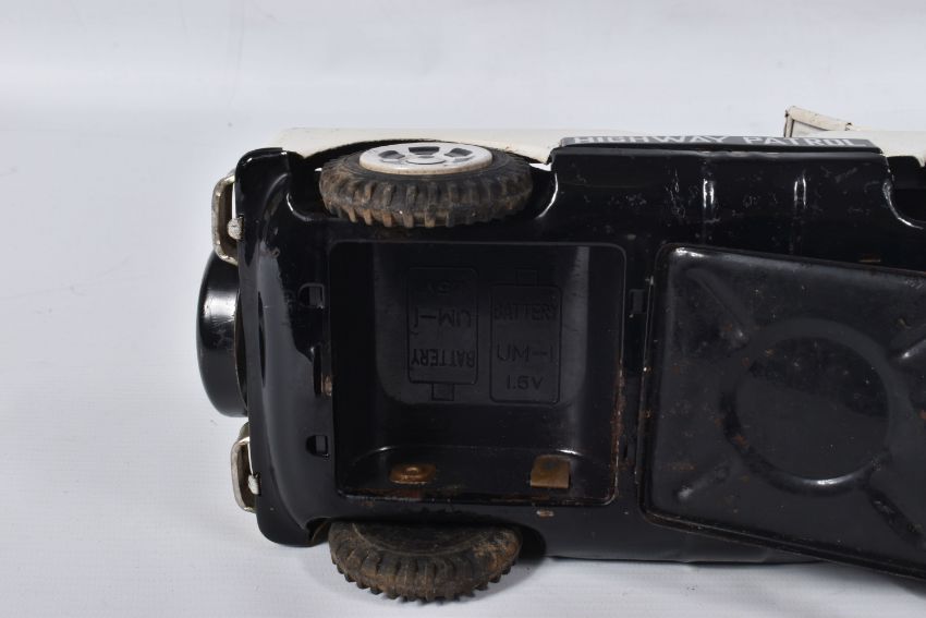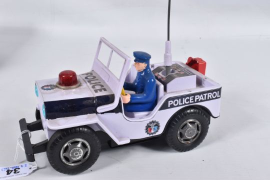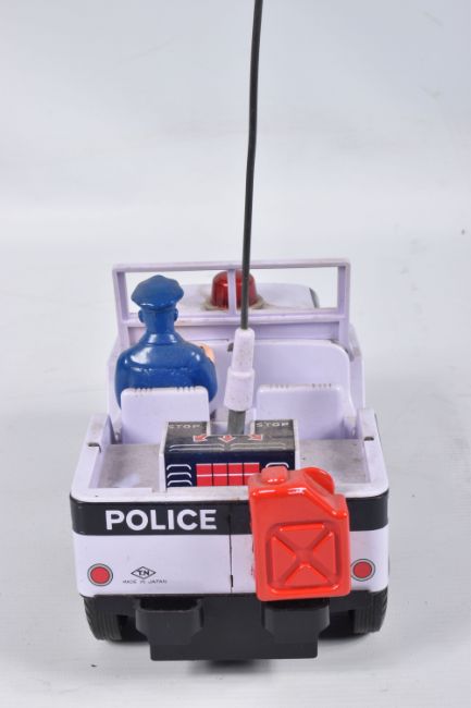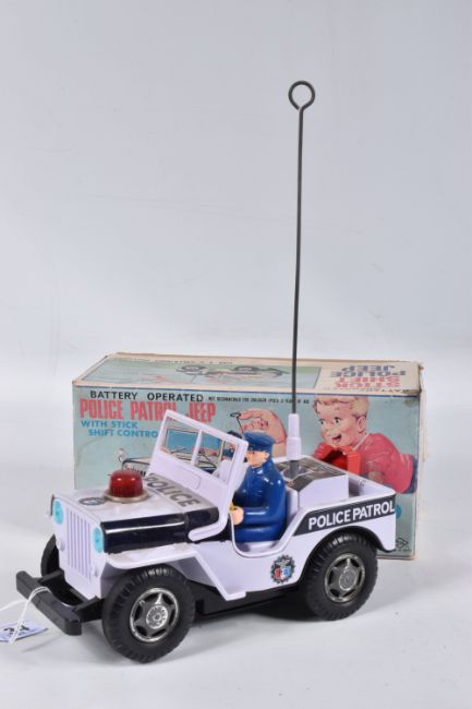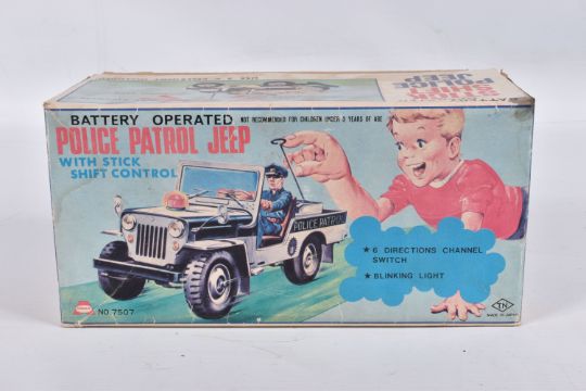 A BOXED NOMURA TN TOYS BATTERY OPERATED TINPLATE STICK SHIFT POLICE JEEP, No.7507, not tested, appears complete and in good condition with only minor marking and wear, battery box in fairly good condition, complete with plastic figure and stick shift extension, TN Toys mark to rear, box marked Asahi in addition to TN Toys and is complete and in fair condition with some damage and wear, with an unboxed Daiya battery operated tinplate Police Highway Patrol Jeep, not tested, appears complete with figure (head loose) but in playworn condition with some minor paint loss and wear, Daiya mark to seat (2)