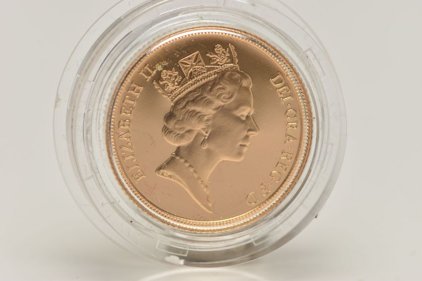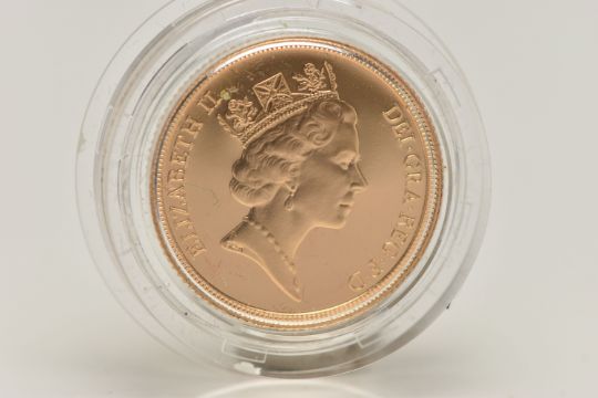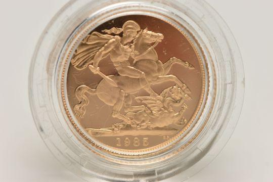 ROYAL MINT FULL GOLD PROOF SOVEREIGN COIN QUEEN ELIZABETH II 1985, .916 fine, 7.98 gram, 22.05mm, mintage 17,242 (as struck)