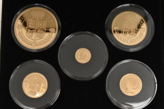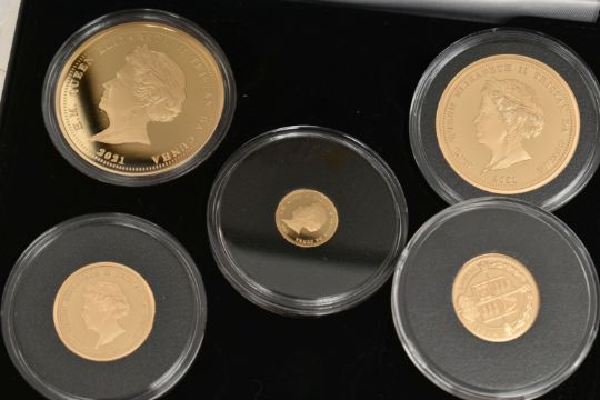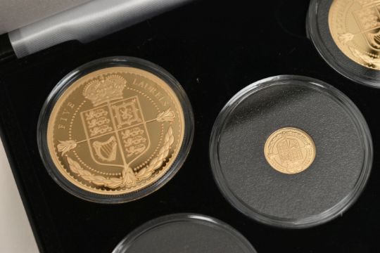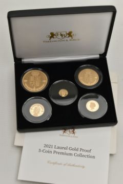 A RARE LAUREL GOLD PROOF 2021 5-COIN PREMIUM COLLECTION, to include five Laurel 22ct all are Tristan da Cunha 38.61mm, 40 gram, double Laurel 22ct, 32mm, 16 gram, Laurel 22ct, 22mm, 8 gram, half Laurel 19.30mm 4 gram, quarter Laurel 14.0mm, 2.0 gram, all include a Heraldic design on the reverse mintage 30 sets