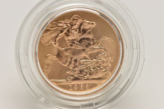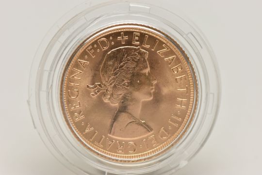 ROYAL MINT FULL GOLD SOVEREIGN COIN QUEEN ELIZABETH 1963, .916 fine, 7.98 gram, 22.05mm, mintage 7,400,000 (as struck)