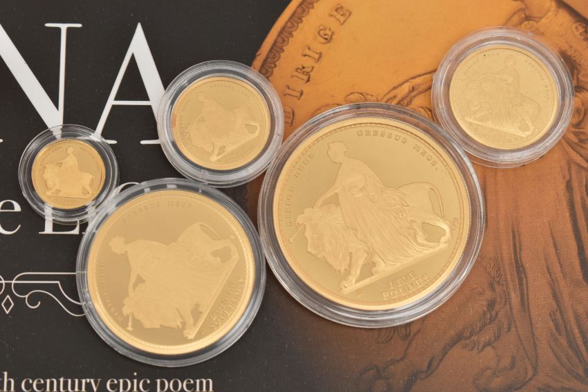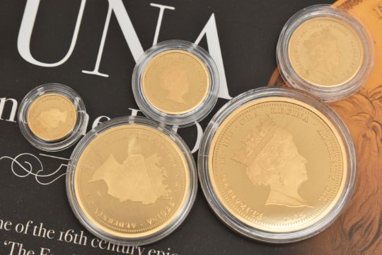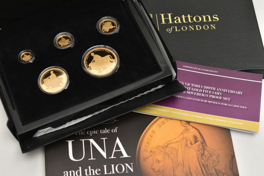A BOXED 'THE 2019 QUEEN VICTORIA 200TH ANNIVERSARY 24 CARAT GOLD FIVE COIN DEFINITIVE SOVEREIGN PROOF SET', Five Pounds to Quarter Sovereign, 'the epic tale of Una and the Lion' together with booklet