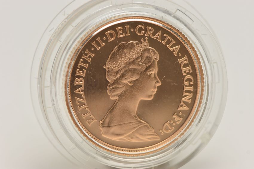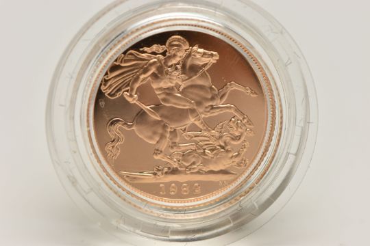 ROYAL MINT FULL GOLD PROOF SOVEREIGN COIN QUEEN ELIZABETH II 1982, .916 fine, 7.98 gram, 22.05mm mintage 22,950 (as struck)