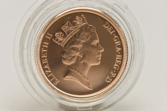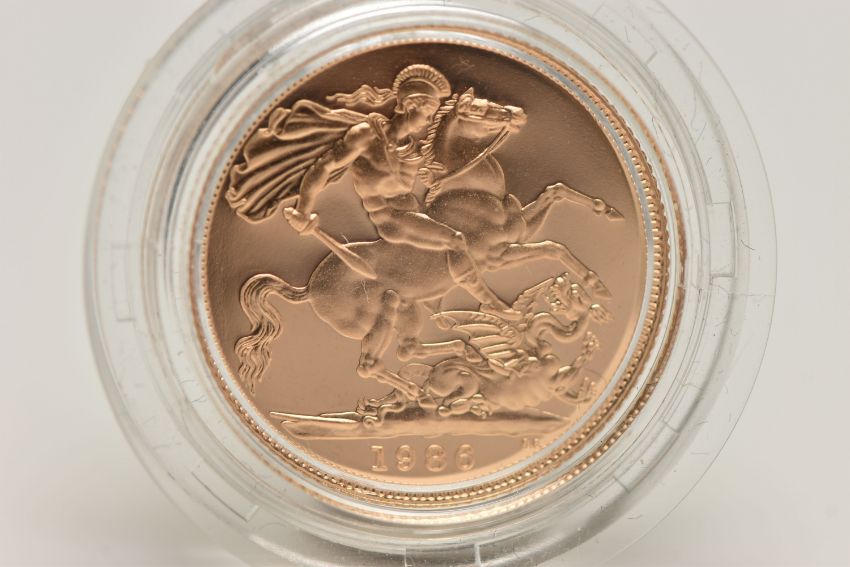 ROYAL MINT FULL GOLD PROOF SOVEREIGN COIN QUEEN ELIZABETH II 1986, .916 fine, 7.98 gram, 22.05mm, mintage 17,579 (as struck)
