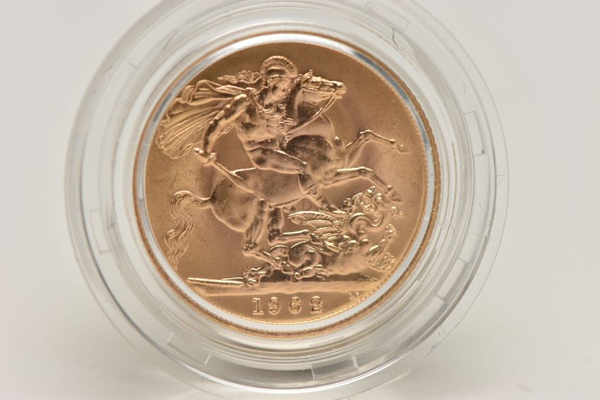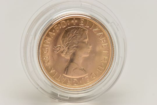 ROYAL MINT FULL GOLD SOVEREIGN COIN QUEEN ELIZABETH II 1962, .916 fine, 7.98 gram, 22.05mm mintage 3,000,000 (as struck)