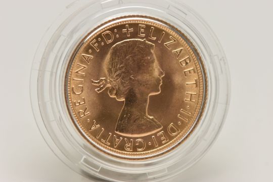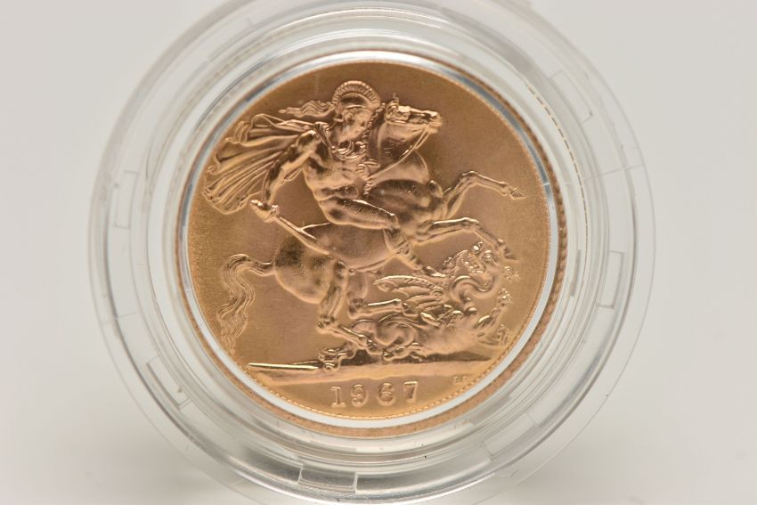 ROYAL MINT FULL GOLD SOVEREIGN COIN QUEEN ELIZABETH II 1967, .916 fine, 7.98 gram, 22.05mm, mintage 5,000,000 (as struck)