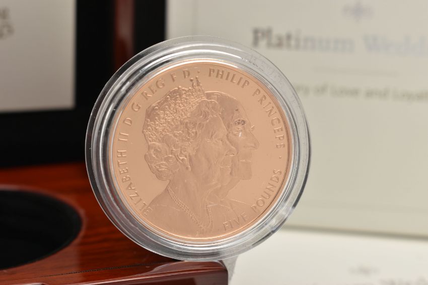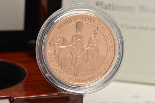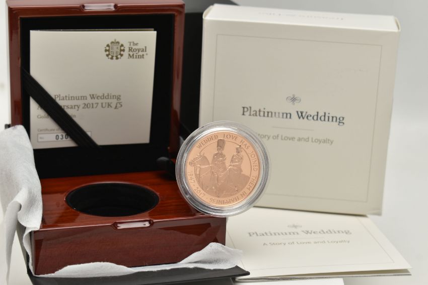 A BOXED ROYAL MINT 'THE PLATINUM WEDDING ANNIVERSARY 2017 UK GOLD PROOF FIVE POUND COIN', No. 0309 of maximum mintage 1375, design by Etienne Millner and John Bergdahl