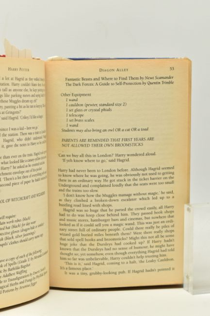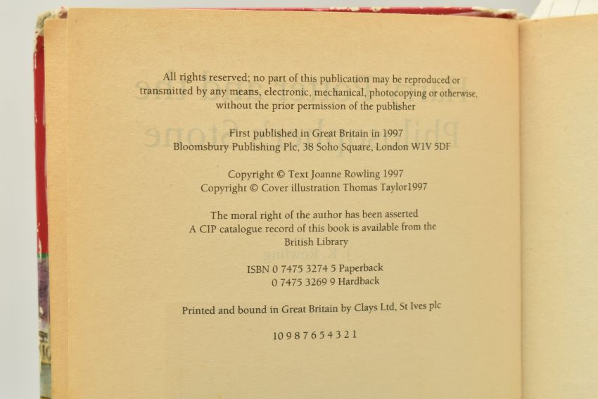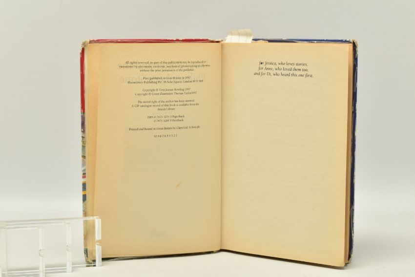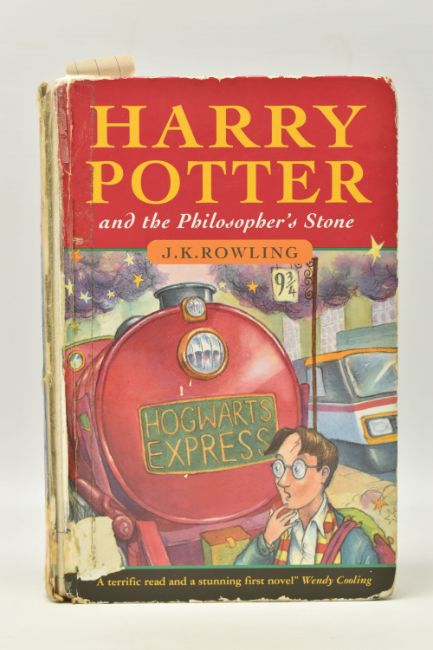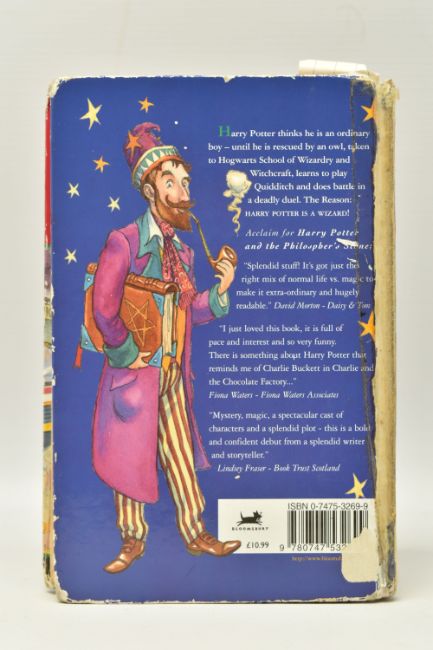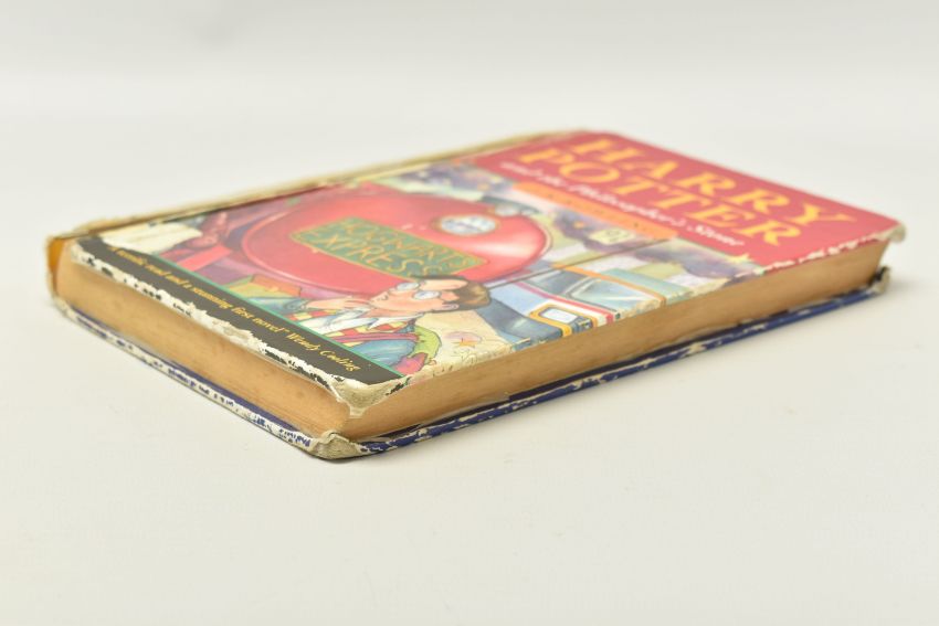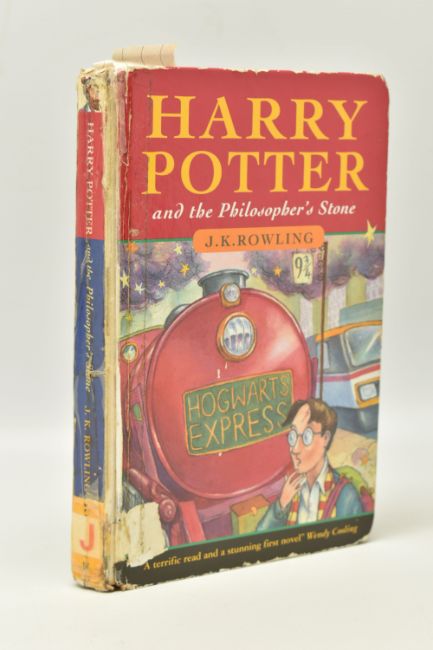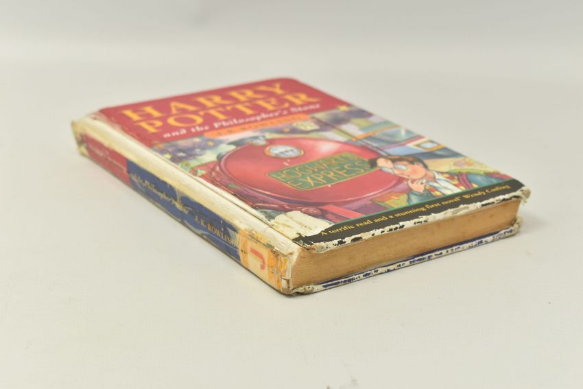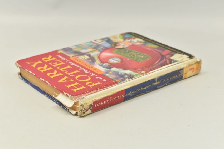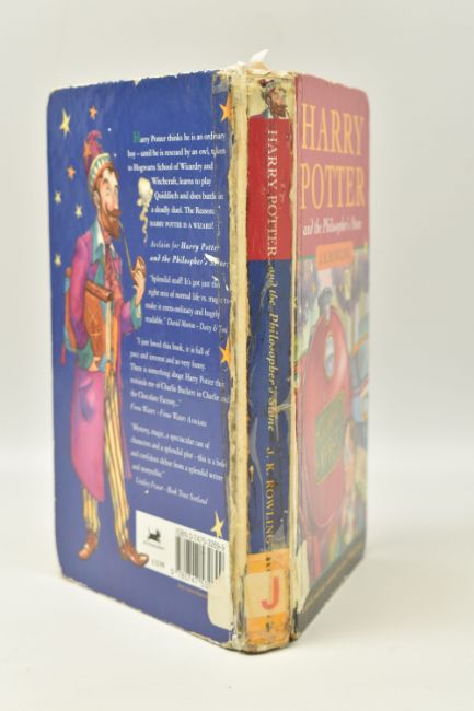 ROWLING; J. K. Harry Potter and the Philosopher's Stone, FIRST Edition, FIRST ISSUE, London: Bloomsbury ,1997, hardback, publishers pictorial boards, with the 10-1 number line on the publisher's imprint page, 8vo, library circulation label indicating withdrawal, CONDITION : some discolouration and staining to pages, spine partially detached, one front end-paper missing, scuffing to front and rear boards and some artwork missing (1), Nb, philosophers is misspelled 'Philosphers' to rear cover ; 'Wizardy and Witchcraft' (rather than Witchcraft and Wizardy ) to rear cover, 1 wand appears twice on page 53, Only 500 copies were printed of which 300 were sent to schools and libraries