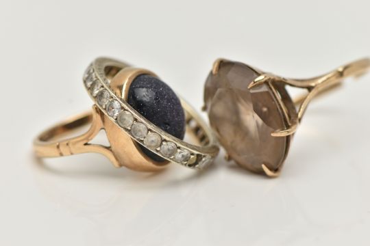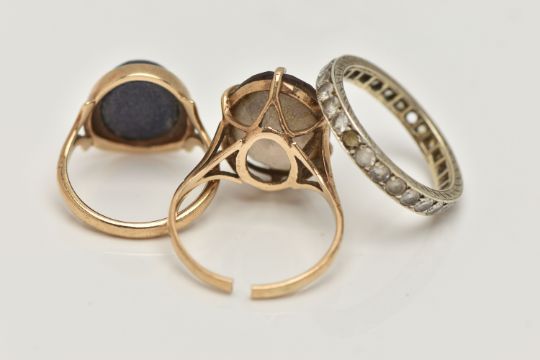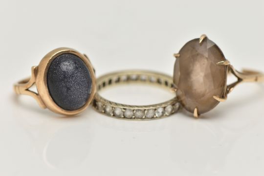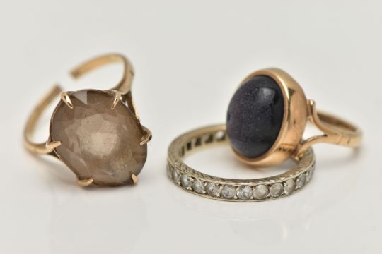 THREE GEM SET RINGS, to include a blue goldstone cabochon ring, collet set to the bifurcated shoulders and polished band, hallmarked 9ct Birmingham, ring size I 1/2, together with an AF smoky quartz ring, oval cut quartz claw set to the bifurcated shoulders and split shank, hallmarked 9ct Birmingham, approximate gross weight 7.1 grams, together with a full eternity ring set with colourless spinels (two stones missing) partial 9.375 stamp, ring size M 1/2, approximate gross weight 2.5 grams (condition report: goldstone cabochon is worn, the smoky quartz ring has a split shank and requires some attention)