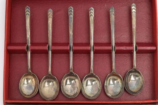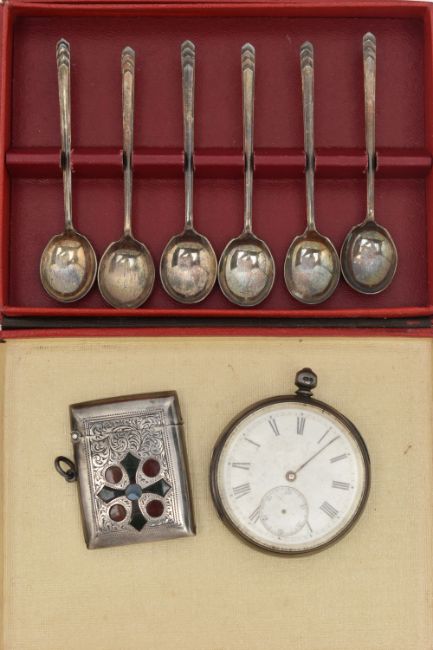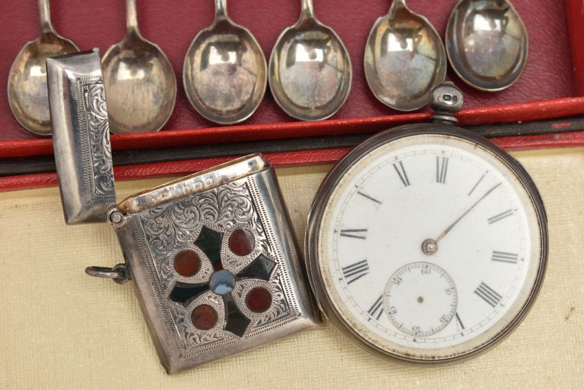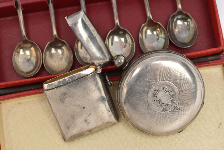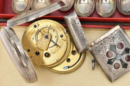 A SELECTION OF SILVERWARE, to include an early 20th century silver vesta case, with engraved scrolling acanthus leaf decoration and inlaid hardstone cross and circular detail, silver hallmark for Birmingham 1919, together with a late Victorian silver open face pocket watch, with silver hallmark for London 1876, only one hand present, and a set of six silver coffee spoons, hallmarks for Sheffield 1943, approximate total weight 190 grams, 5.1 ozt,